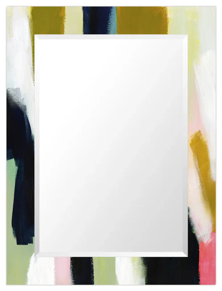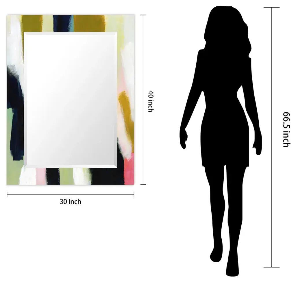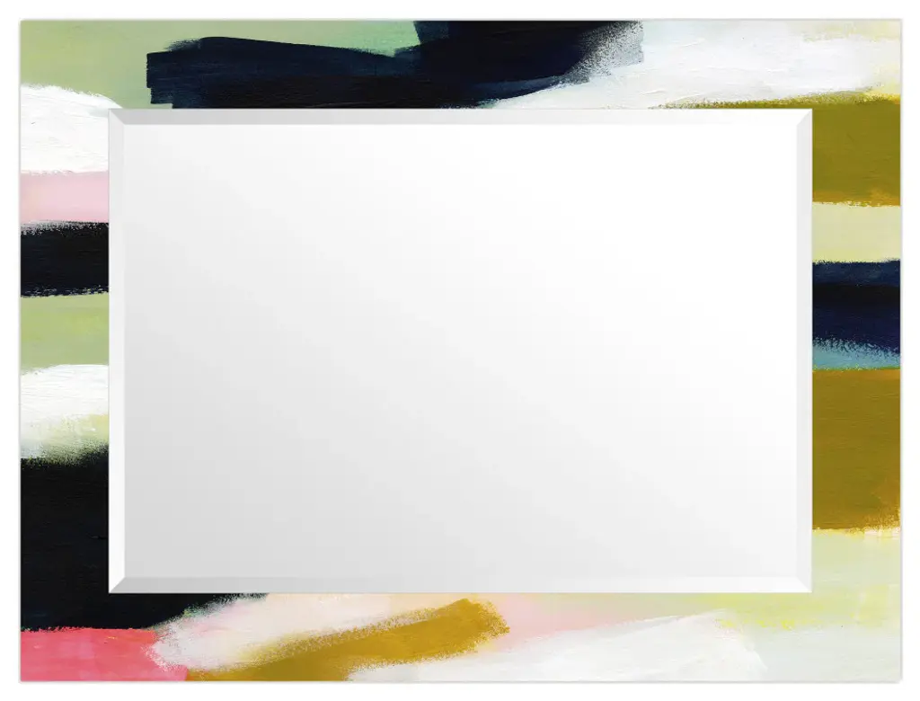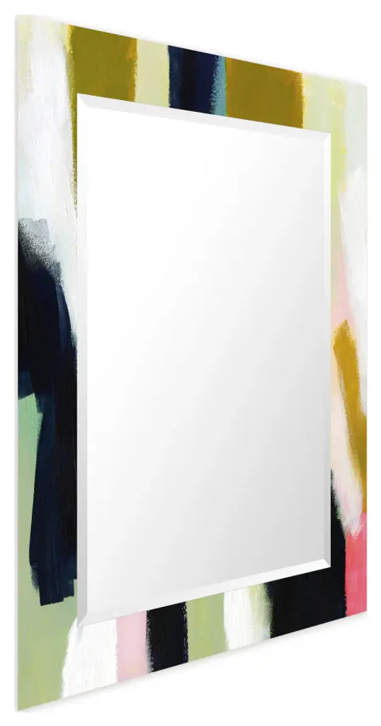Empire Art Direct"™s collection of printed, frame-less, free floating, tempered glass was inspired by the French technique of Verre Eglomise in which artist''s literally painted the back of clear glass so that when viewed from the front the painting is brought to life under the depth of the glass. This incredible piece by Victoria Borges takes that same tempered glass and displays a beveled mirror, centered in front of a beautiful green, black and pink abstract. 4 strong steel hangers are attached to the back of the mirror for a quick and easy vertical or horizontal installation.