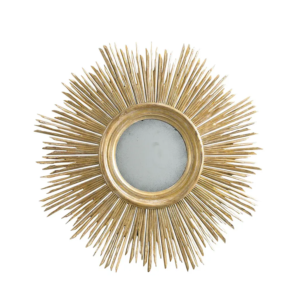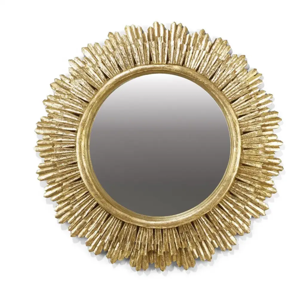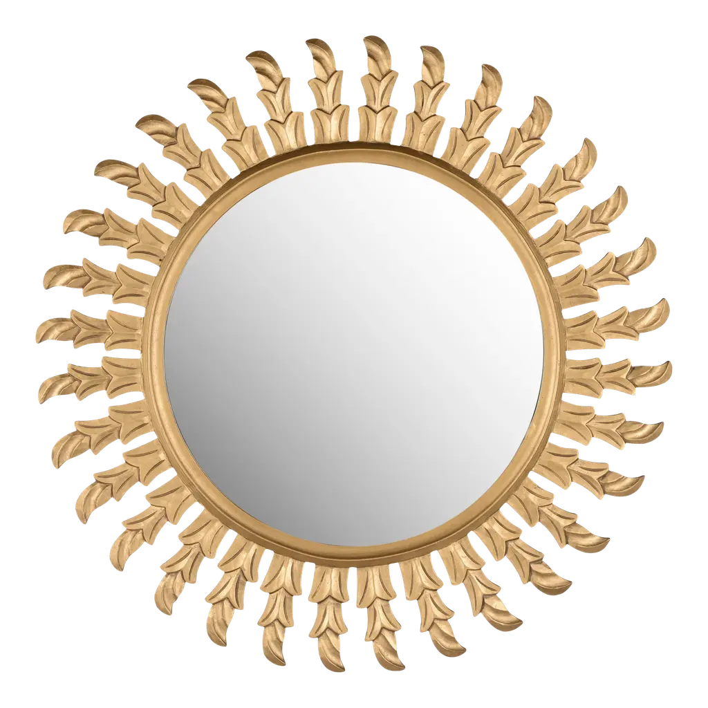 Radiating warmth and charm, this round wood mirror evokes the beauty of a sunflower with its sculpted, petal-like frame finished in antique gold. The organic form and rich detailing bring a touch of vintage elegance.