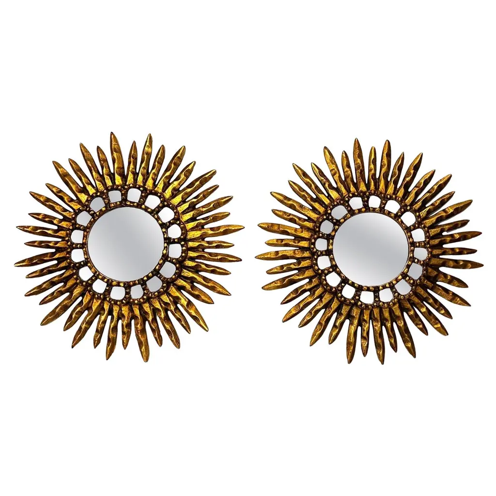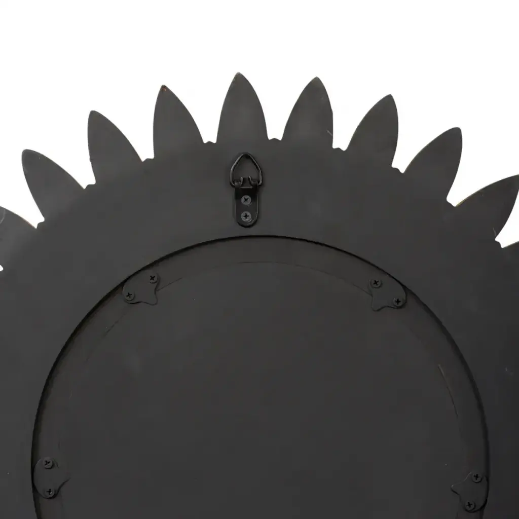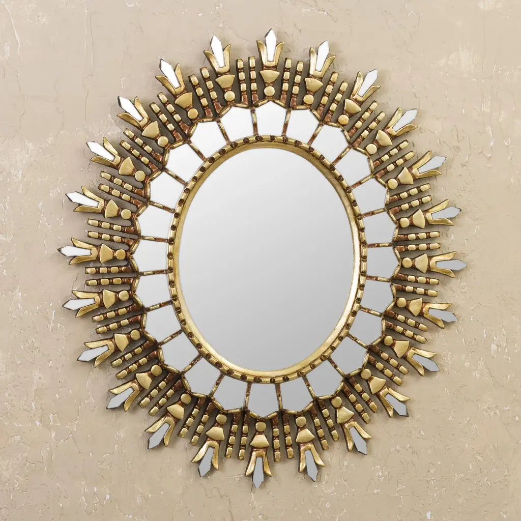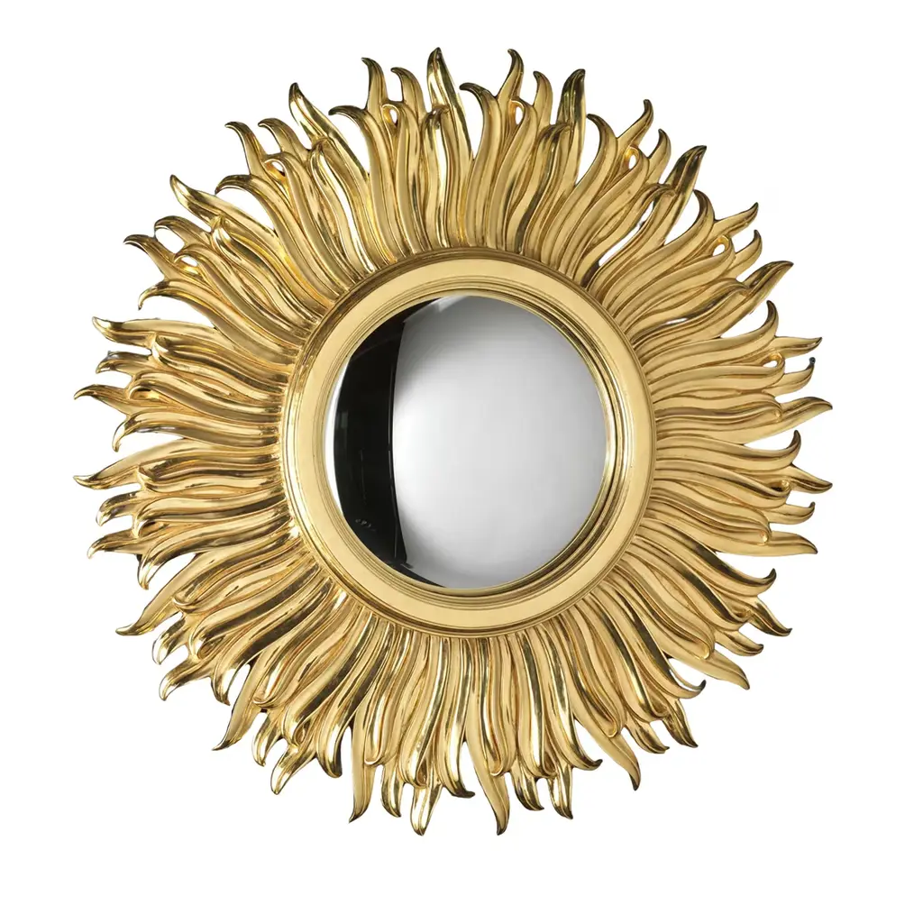 Radiating warmth and charm, this round wood mirror evokes the beauty of a sunflower with its sculpted, petal-like frame finished in antique gold. The organic form and rich detailing bring a touch of vintage elegance.
