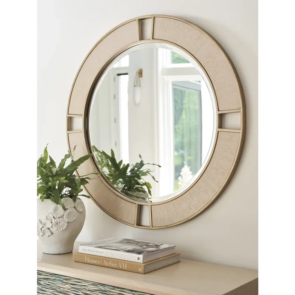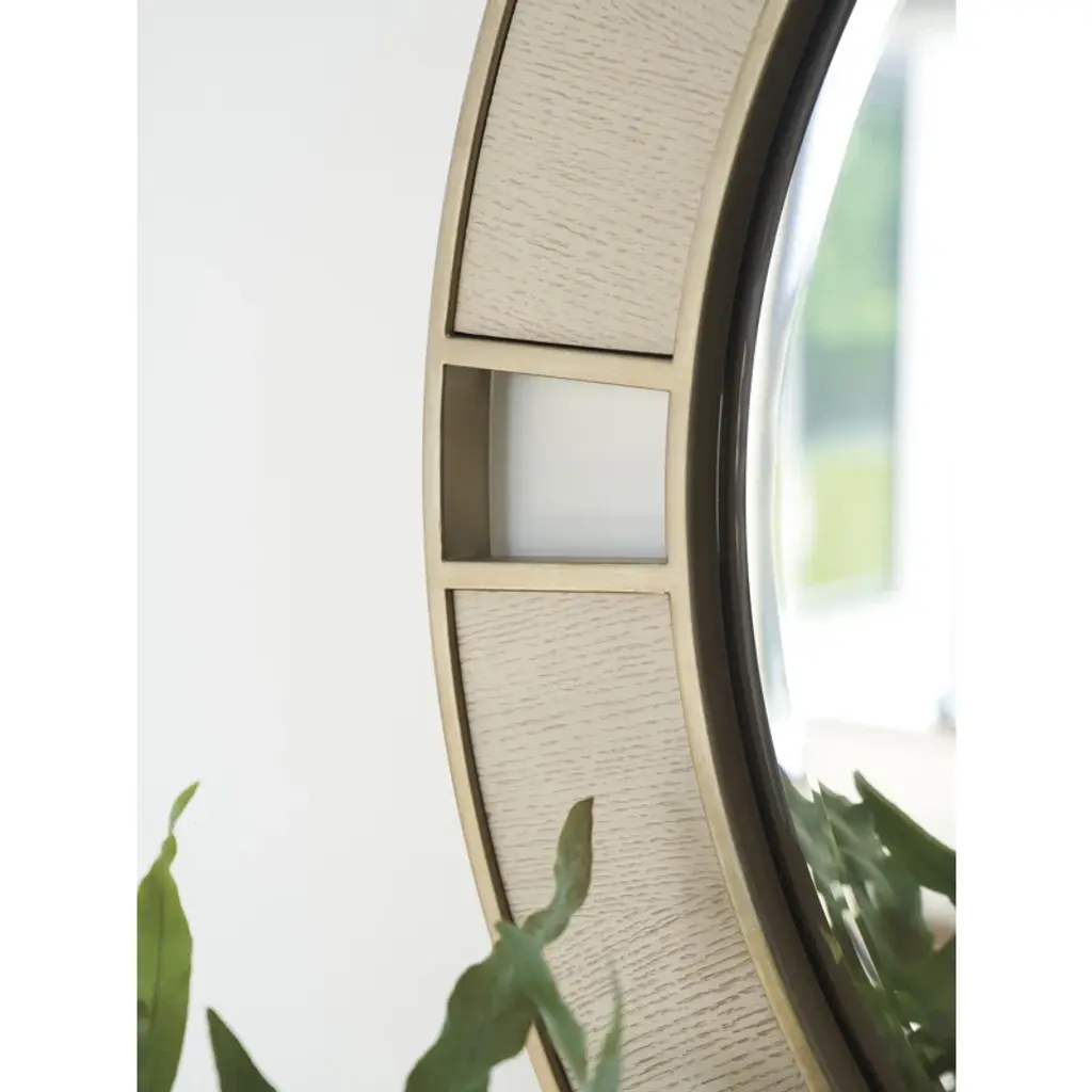 In a timeless compass-like profile, the Modern Mood round mirror combines quartered oak veneers in the diamond finish with wire-brush detailing and warm pewter metal accents for a striking focal-point piece. Unbound by geographical design, Modern Mood presents itself as an evolution of design choices, spanning a variety of decades and design movements, while maintaining an unmistakably modern aesthetic that transcends time. The 90-piece collection includes a bedroom, dining room, home office, accent, and occasional items characterized by substantive forms with soft architectural details. Elevated materials and brushed metal accents in a warm pewter finish are evident throughout the collection, including metal banding and edging as well as marble and glass accents. Crafted with flat-cut quartered oak veneer with wire-brushed detailing, Modern Mood is presented in two finishes: Mink and diamond. Delivering a dark, earthy brown with notes of black, Mink delivers a timeless aesthetic. A much lighter presentation is achieved with the crystal-like alabaster and pewter hues of the diamond finish, delivering a soft sophistication.