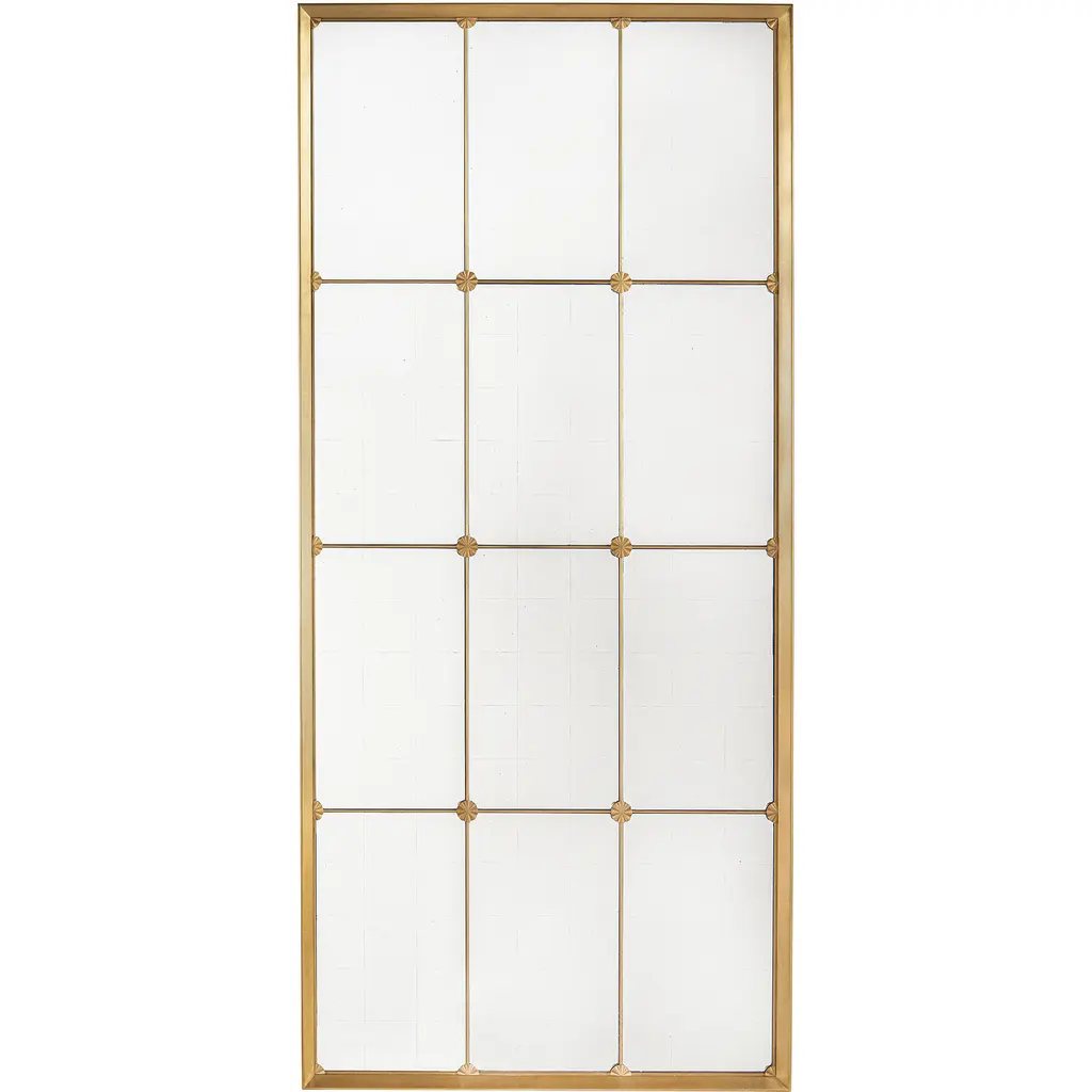 Very elegant vertical mirror with shaped top frame that tapers lightly down to the bottom. The frame is welded metal with all rounded edges in a handsome gold leaf finish with matching rosettes separating the six glass mirrored panels. In Stock February 2026 Elegant style Gold leaf finish Six glass mirrored panels with rosettes This image is for illustrative purposes only. The colors shown are accurate within the constraints of lighting, photography, and the color accuracy of your screen.