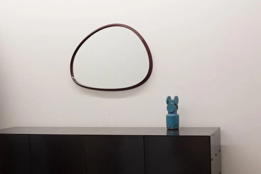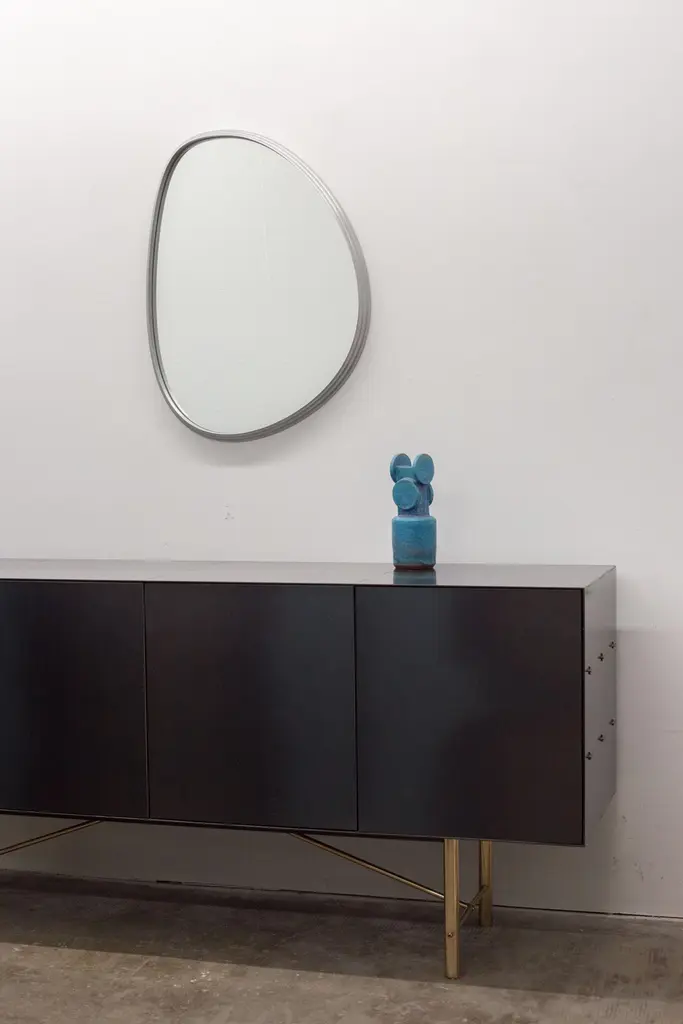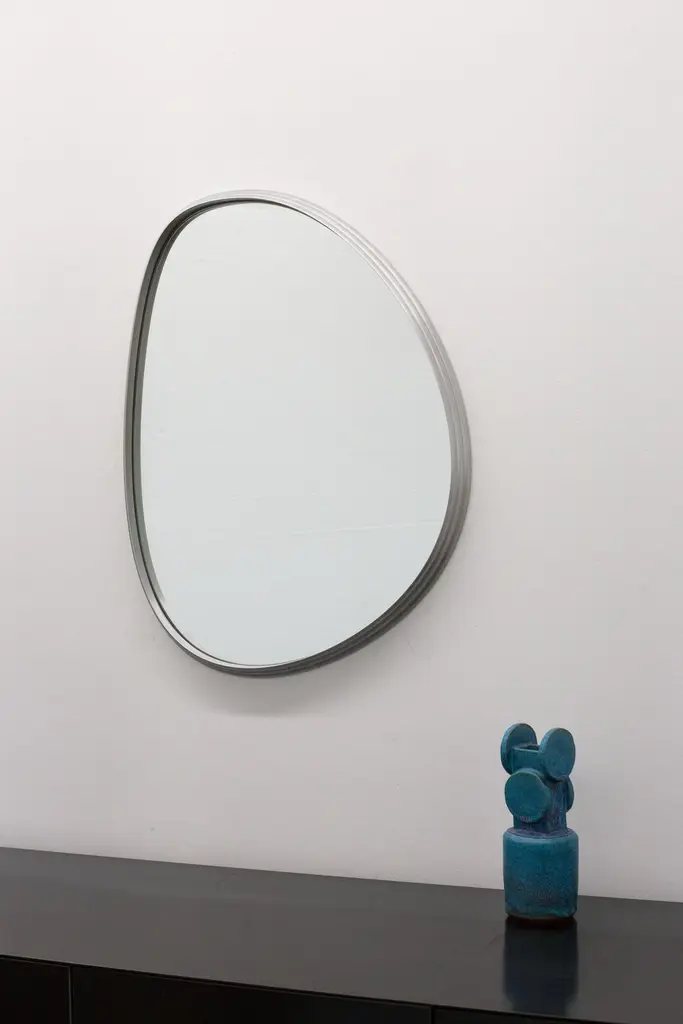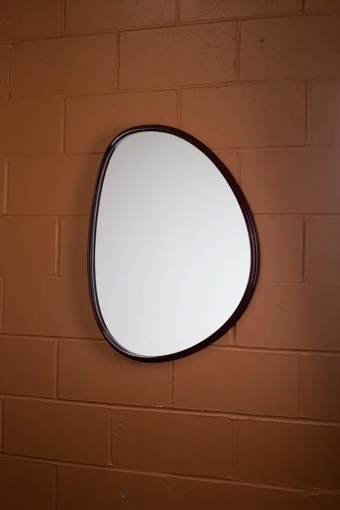 Organically shaped mirrors, drawn by hand and resolved in machined solid aluminum - the ambition is to create a tension with the precise form of the imperfect shape.Polished, plated, or painted finishes available.Custom shape, sizing and finishes available, please inquire.Overall dimensions: 22" W x 1.5" D x 29.5" HAll new format pieces are handmade in Vancouver, Canada.