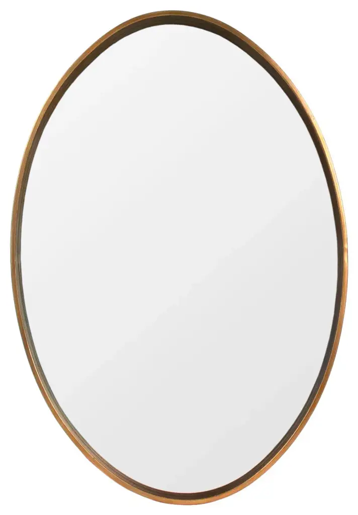 Oval mirror framed with metal band in antique bronze finish. Zentique combines unique designs with high-end materials to bring you the very best home decor in the business. When you order a product engineered and manufactured by Zentique, you''re guaranteed to get a product that is built to last for years and years to come. This product will come in ship-safe packaging materials and will be sure to impress!DimensionsLength: 24 in. Width: 2. 5 in. Height: 35. 25 in. Some assembly required: No