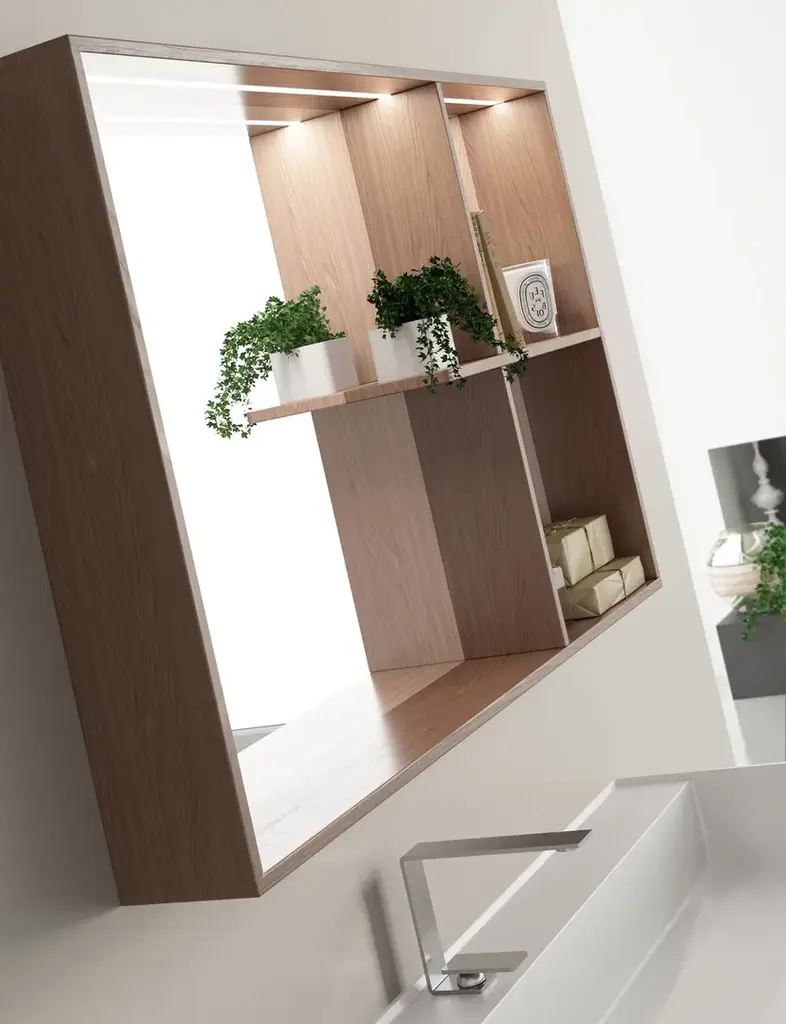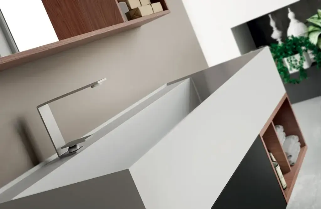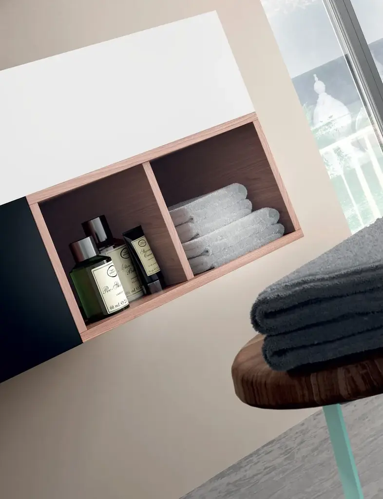 Syn 12 is a bathroom composition that includes:SYN117 Mirror with frame and LED - 110 x 13 x H 75 cmSYN200 Grid for objects - 25 x 13 x H 75 cmSYN50 Tecnoril washbasin - 110 x 43 x H 18 cmSYN1X 1-drawer washbasin base - 70 x 43 x H 22 cmSYN14C Open unit - 40 x 43 x H 22 cmFinishes: matt slate gray lacquered - Siena elm melamine - Matt white Tecnoril washbasinDesigned by Emanuele Gargano e Marco Fagioli, Syn is a new concept in the world of bathroom furnishings, and blends extensive modularity and essential design. The well proportioned elements, lacquered and melamine-coated, are merged to create an alternative idea of space in the bathroom.