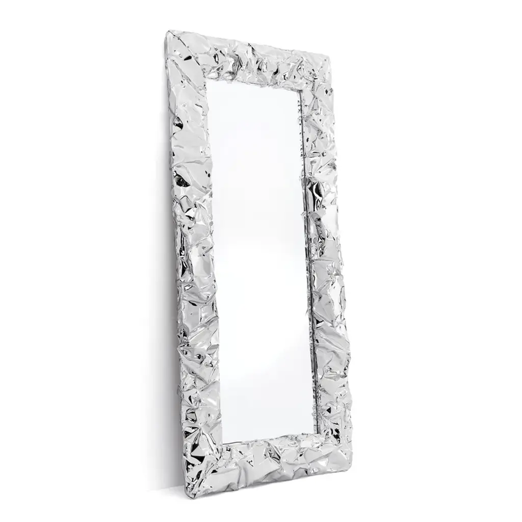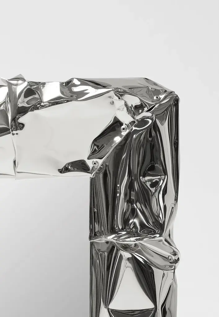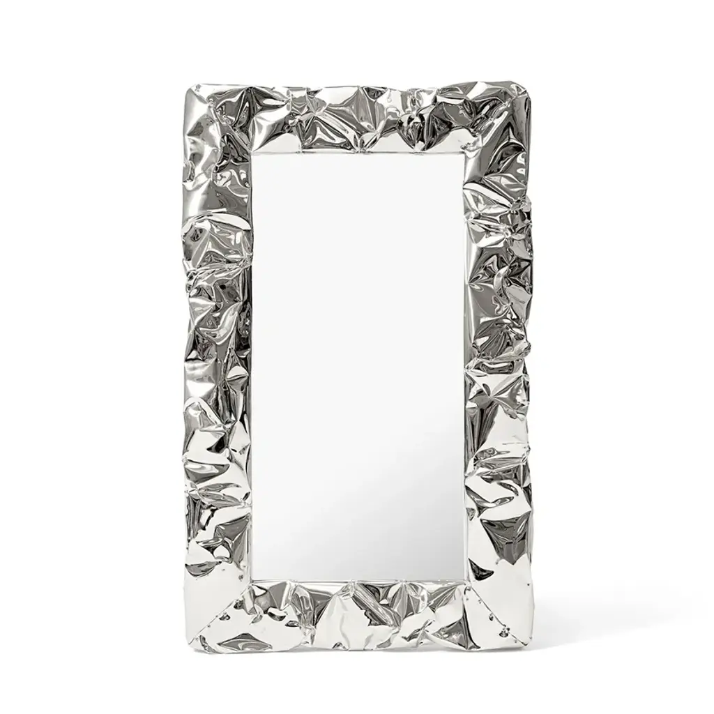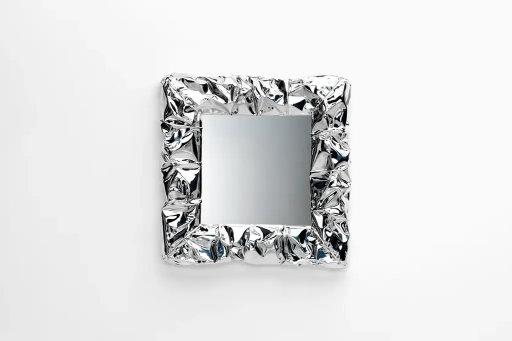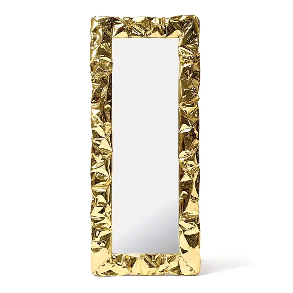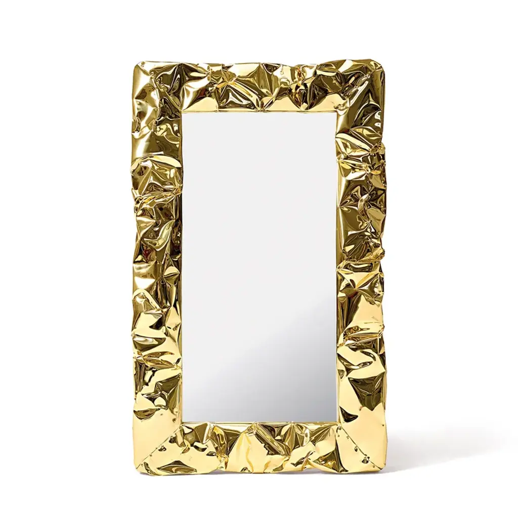 Tab.U is a mirror with frame in aluminium wrinkled by hand.Note: being hand-crafted every piece is unique.Finishing: chrome, mirror gold.