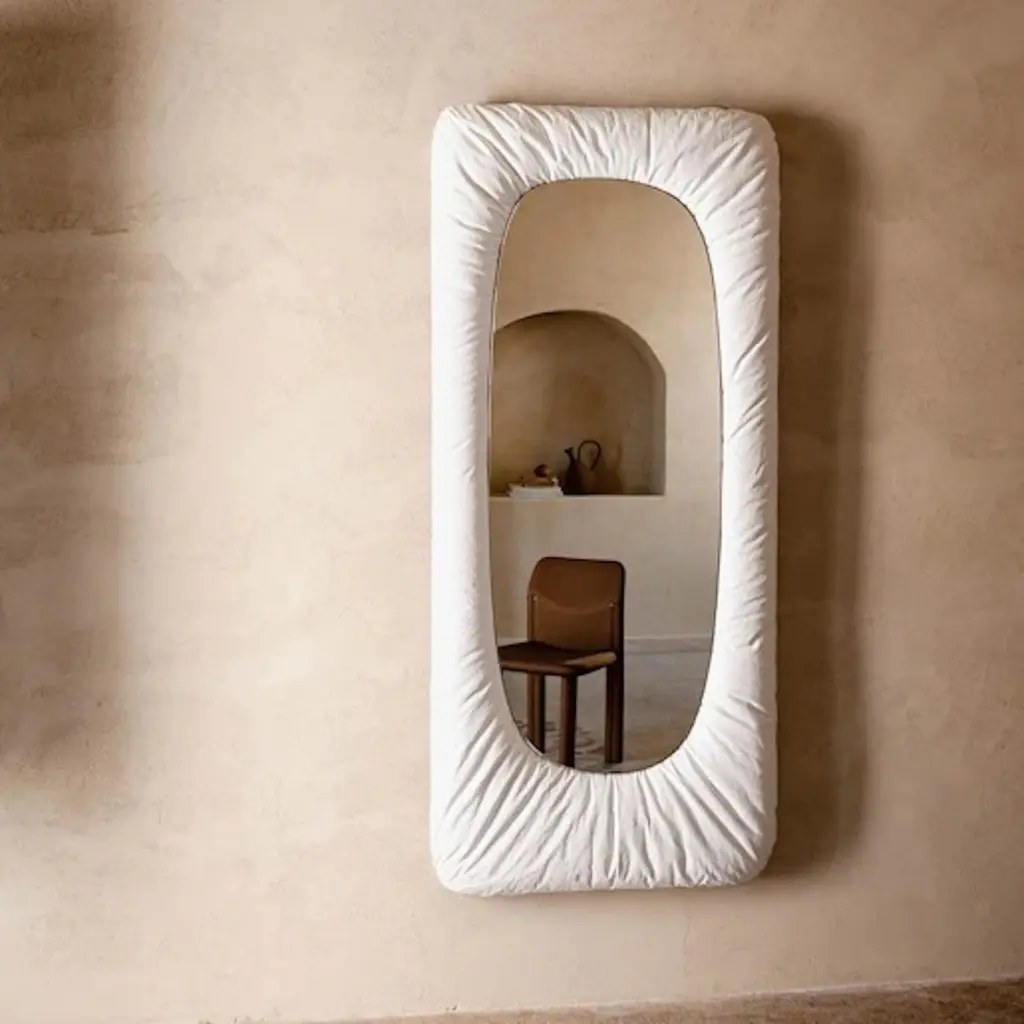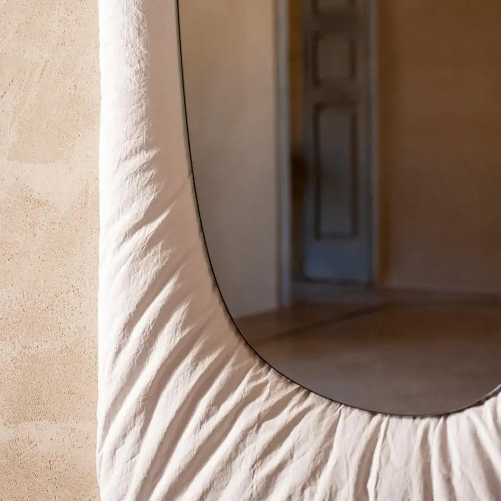 Wall mirror with wooden frame covered with natural and paper fibers.One size.Stellar has the appearance of a mirror buried in a cushion. Designed by Faye Toogood, Stellar reflects the materials and forms used throughout Cosmic – the studio’s collaborative collection with Tacchini. Faye Toogood’s disruptive energy takes Tacchini’s trademark upholstery and stuffs it in unexpected places. Here, the hard and shiny surface of a mirror is couched in a puffy, tactile frame.