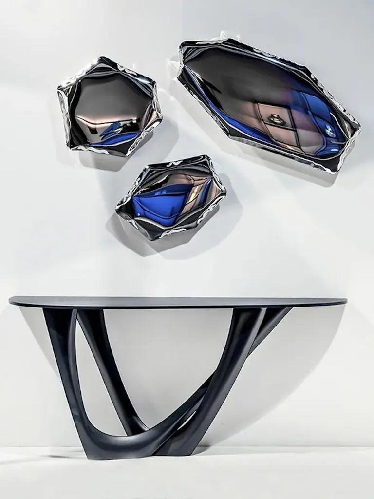 Tafla mirrors by ZietaPolished stainless steelTafla C2Measures: Height: 58.67 in (149 cm)Width: 37.01 in (94 cm)Depth: 2.37 in (6 cm)Tafla C3Measures: Height: 48.82 in (124 cm)Width: 26.38 in (67 cm)Depth: 2.37 in (6 cm)Tafla C4Measures: Height: 39.38 in (100 cm)Width: 19.69 in (50 cm)Depth: 2.37 in (6 cm)--The objects that constitute ZIETA universe function not only as independent works of art, but they take on a stellar dimension when arranged together in larger sets. Bounded by common gravity and revolving along mutual orbits they can create astonishing compositions. The closeness between the elements enlivens the steel surfaces with luminous interactions that multiply reflections and refract lights.The possibilities of arrangement are endless. Therefore, in order to guide you through the steel universe of ZIETA, we have prepared an atlas of the most captivating constellations. The objects of this universe are mirrors TAFLA O and TAFLA C as well as CRYSTAL and smaller KAMYKI and PIN. At the end of this atlas you will find an exhaustive list of all the constellations. They have been codified, dimensioned and laid out on standard walls, in order to facilitate the choice of the best composition for your interior.