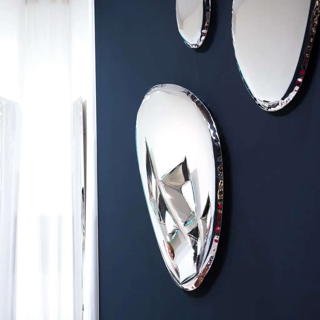 Polish innovator Oskar Zieta works from all angles with his Tafla Mirror Collection. Extending the innovative FIDU (short for Free Inner-pressure Deformation) process, he expands the concept of his original crumpled furniture to wall hangings that are nothing short of works of art. While they suggest silvery mylar balloons, each piece is made from thin welded sheets of steel and inflated with high-pressure air, making each one of a kind.