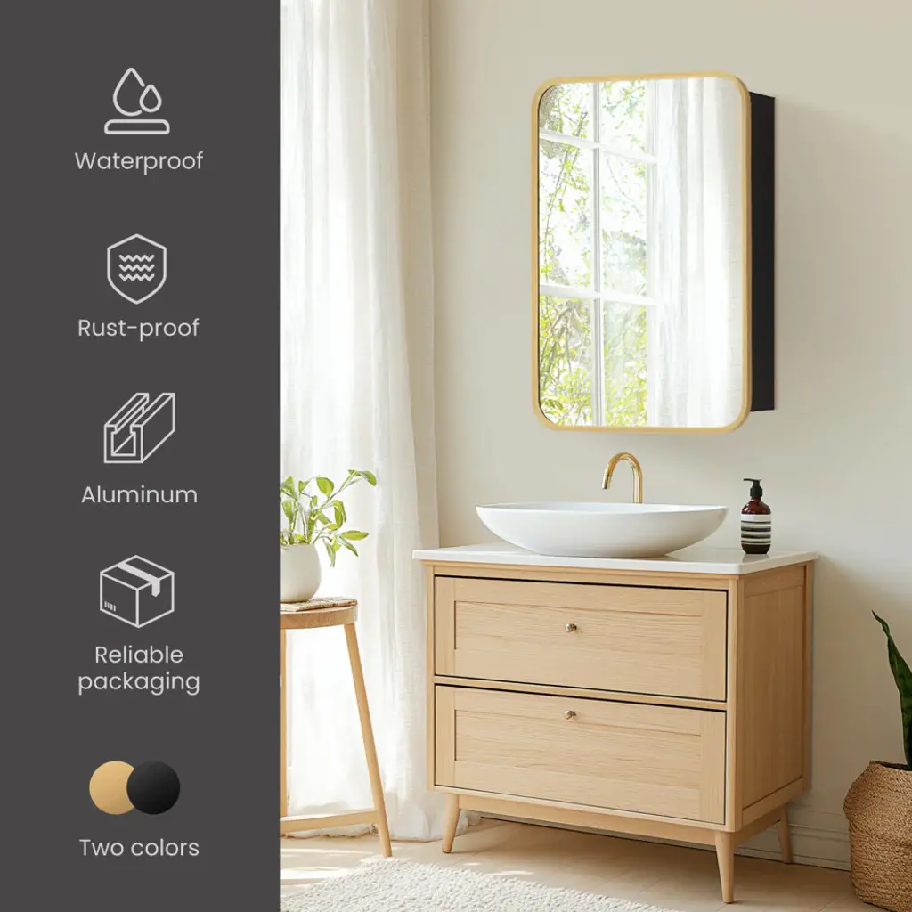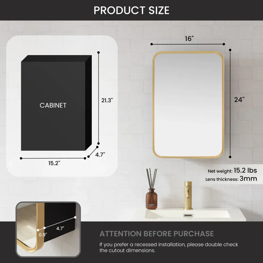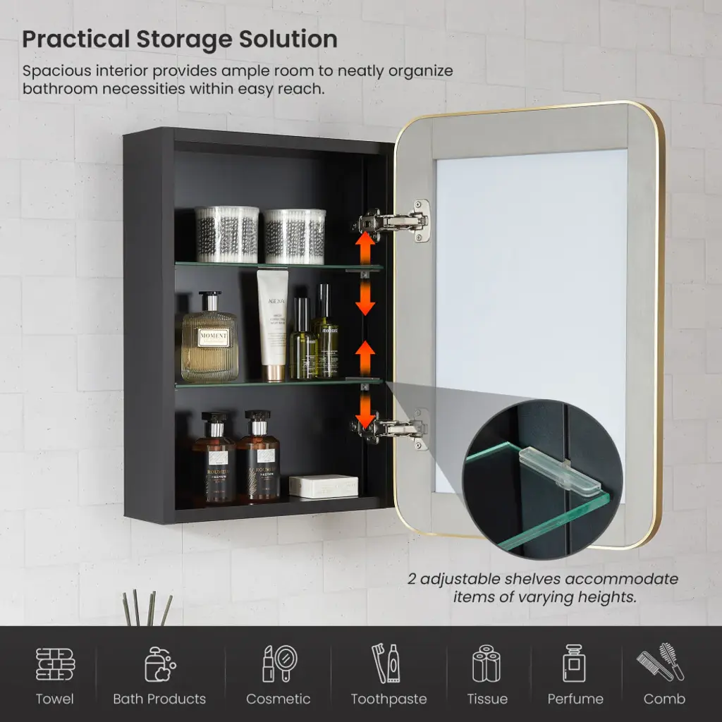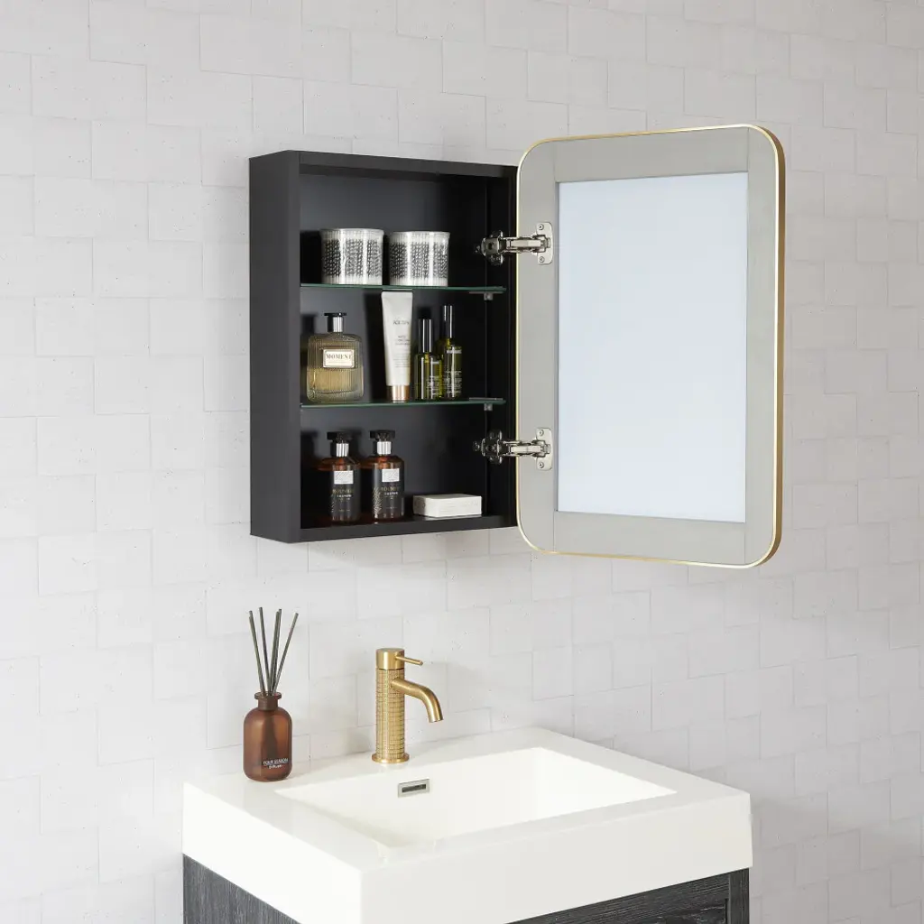Elevate your bathrooms aesthetic appeal with our elegant Talayuela Wall Mirror series featuring an integrated medicine cabinet. Constructed from the finest aluminum and glass materials, this simple yet stylish mirror provides superior reflective clarity, reliable corrosion resistance, and ample storage space for your toiletries that can be tailored to your needs. Choose from two frame finishes and multiple size options to ensure the ideal complement to your existing bathroom vanity. Features Simple, modern, aluminum-framed cabinet mirror lends a trendy industrial look to your space. Available in Brushed Gold or Brushed Black finish to suit your personal style preferences. Multiple size options that complement most sizes of bathroom vanities.Constructed of durable, high-quality materials to deliver years of reliable beauty and performance.Features a 3mm-thick, premium, copper-free silver mirror that resists edge corrosion.Constructed with double-sided, sturdy soft-closing hinges and adjustable shelving that maximizes the storage space inside.Safety mirror is explosion-proof to prevent injury should glass be accidentally damaged.Wall-mounted mirror is ready for immediate hanging; only a simple install is required. Contemporary rectangular shape is ideal for hanging. Includes metal inset hangers attached to mirror back for fast, easy mounting.1-year limited manufacturer warranty, so you can purchase with peace of mind.• Simple assembly required. Installation instructions, hardware, and mounting bracket included.LED Mirror Dimensions: Glass Thickness: 0.12"16 inch: 24"H x 16"W x 5.9"D 20 inch: 32"H x 20"W x 5.9"D 24 inch: 32"H x 24"W x 5.9"D 36 inch: 32"H x 36"W x 5.9"D 48 inch: 32"H x 48"W x 5.9"D All specifications are subject to change without prior notice.