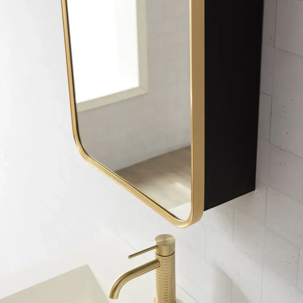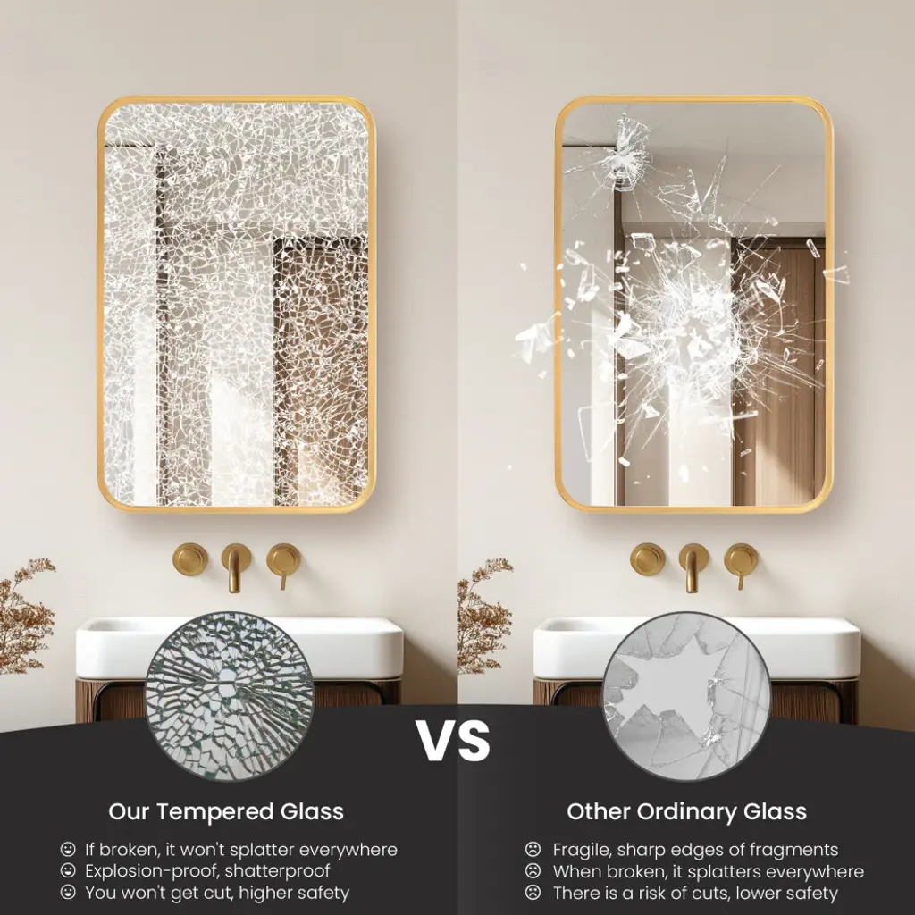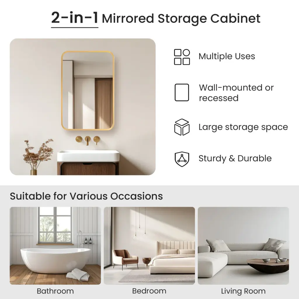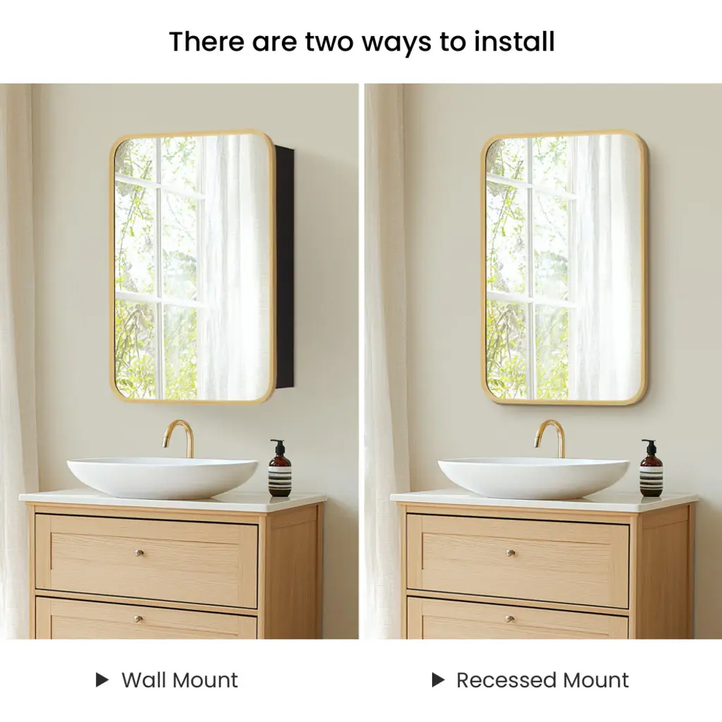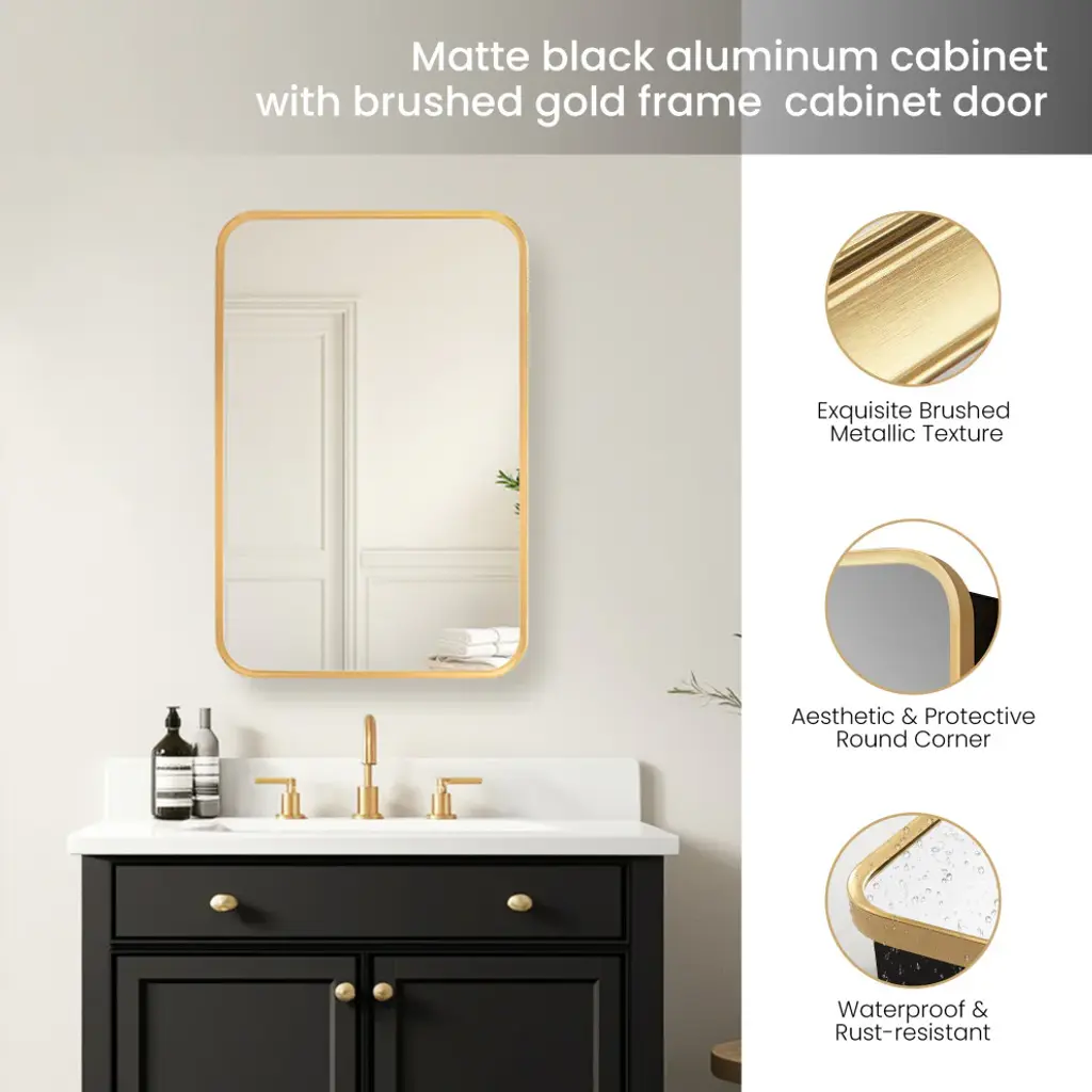 Elevate your bathrooms aesthetic appeal with our elegant Talayuela Wall Mirror series featuring an integrated medicine cabinet. Constructed from the finest aluminum and glass materials, this simple yet stylish mirror provides superior reflective clarity, reliable corrosion resistance, and ample storage space for your toiletries that can be tailored to your needs. Choose from two frame finishes and multiple size options to ensure the ideal complement to your existing bathroom vanity. Features Simple, modern, aluminum-framed cabinet mirror lends a trendy industrial look to your space. Available in Brushed Gold or Brushed Black finish to suit your personal style preferences. Multiple size options that complement most sizes of bathroom vanities.Constructed of durable, high-quality materials to deliver years of reliable beauty and performance.Features a 3mm-thick, premium, copper-free silver mirror that resists edge corrosion.Constructed with double-sided, sturdy soft-closing hinges and adjustable shelving that maximizes the storage space inside.Safety mirror is explosion-proof to prevent injury should glass be accidentally damaged.Wall-mounted mirror is ready for immediate hanging; only a simple install is required. Contemporary rectangular shape is ideal for hanging. Includes metal inset hangers attached to mirror back for fast, easy mounting.1-year limited manufacturer warranty, so you can purchase with peace of mind.• Simple assembly required. Installation instructions, hardware, and mounting bracket included.LED Mirror Dimensions: Glass Thickness: 0.12"16 inch: 24"H x 16"W x 5.9"D 20 inch: 32"H x 20"W x 5.9"D 24 inch: 32"H x 24"W x 5.9"D 36 inch: 32"H x 36"W x 5.9"D 48 inch: 32"H x 48"W x 5.9"D All specifications are subject to change without prior notice.