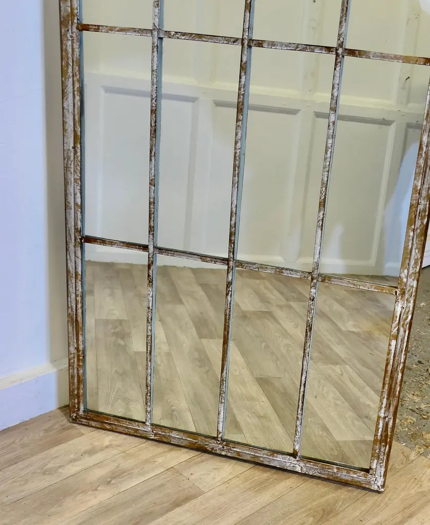 Tall Industrial Style Arched Window Mirror This is a tall and very attractive stand alone, the Metal Window Frame Mirror has several rectangular sections set off with an arched top An impressive piece made in Metal which has a slightly distressed looking finishThe Mirror is 53” tall and 26” wideNG271