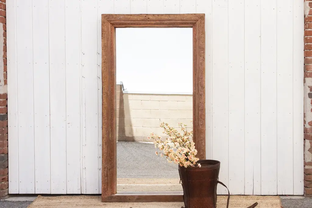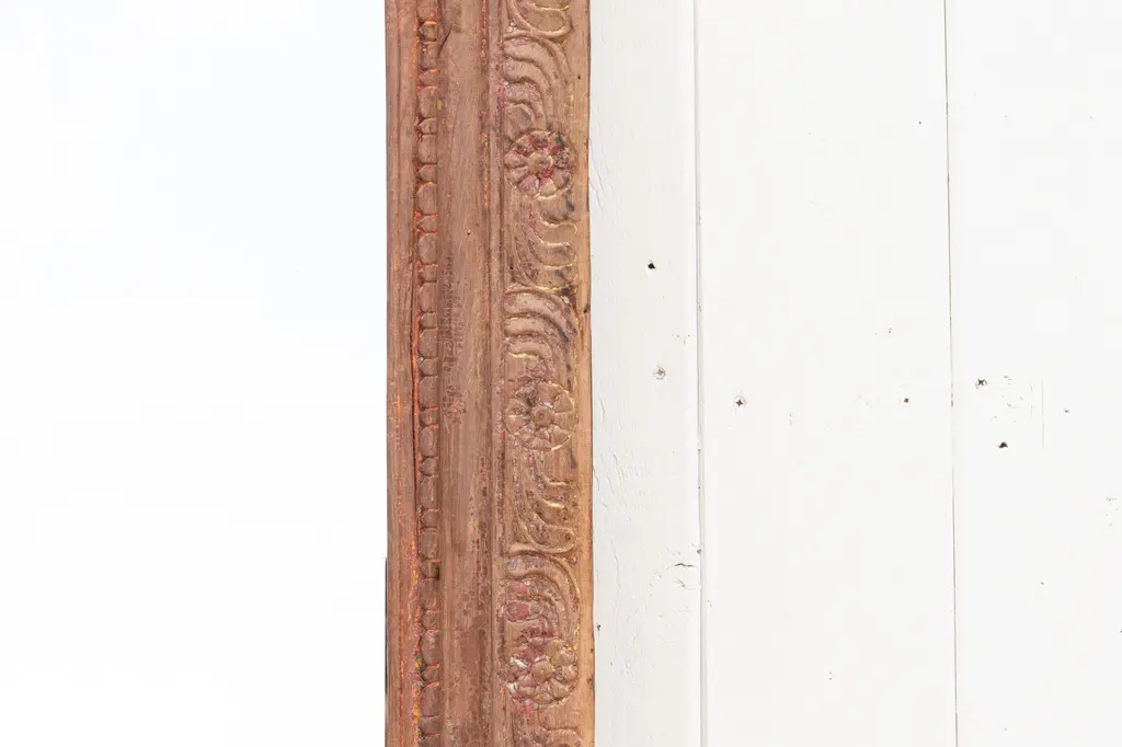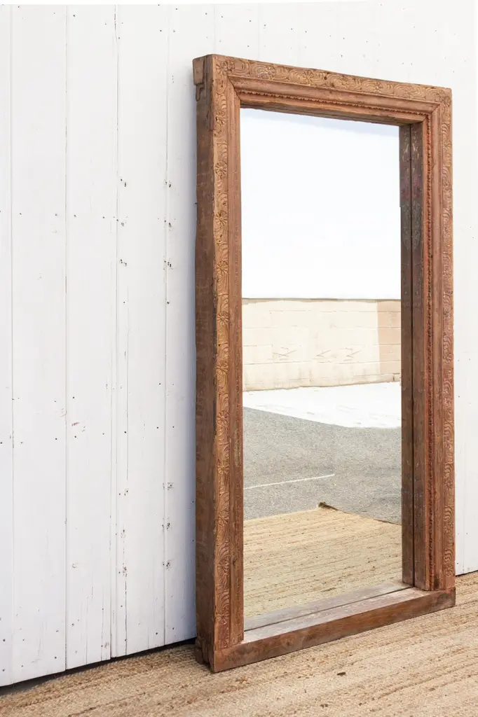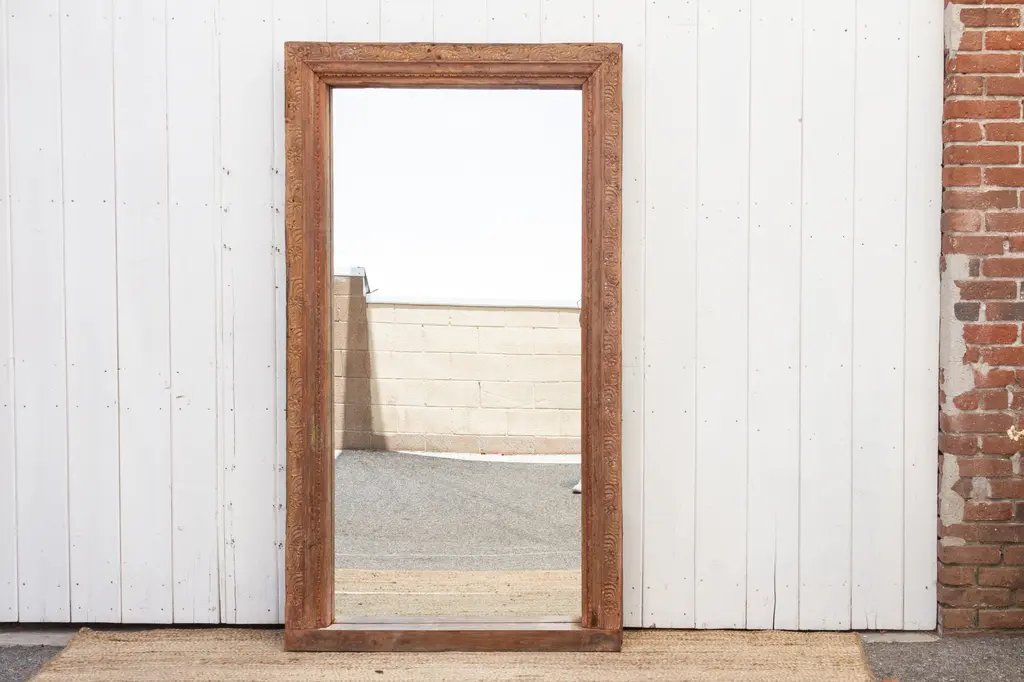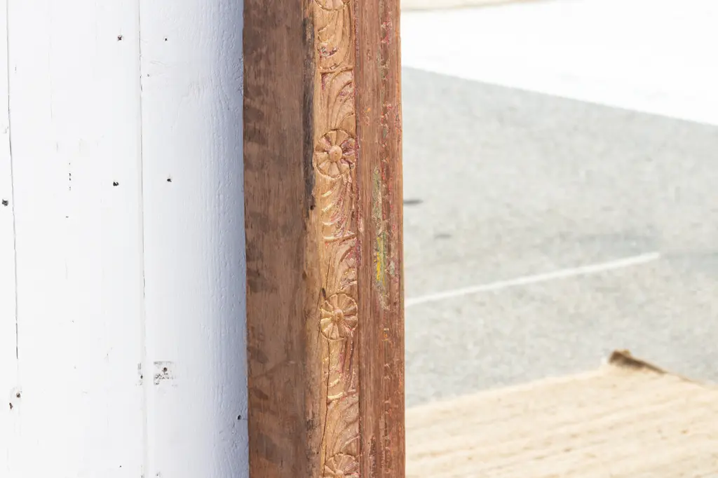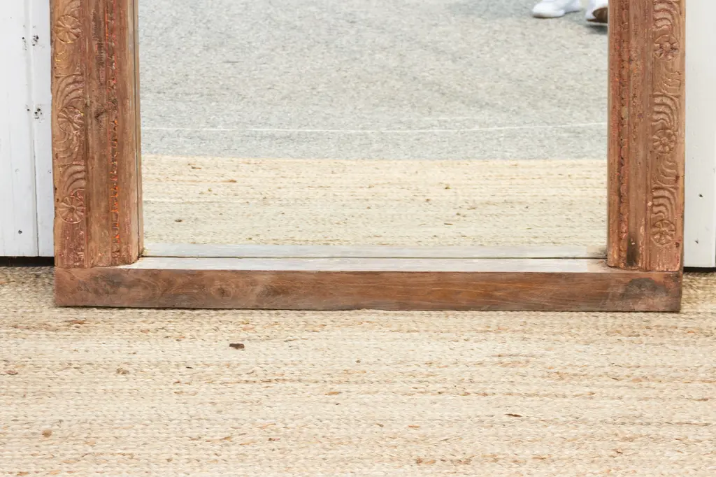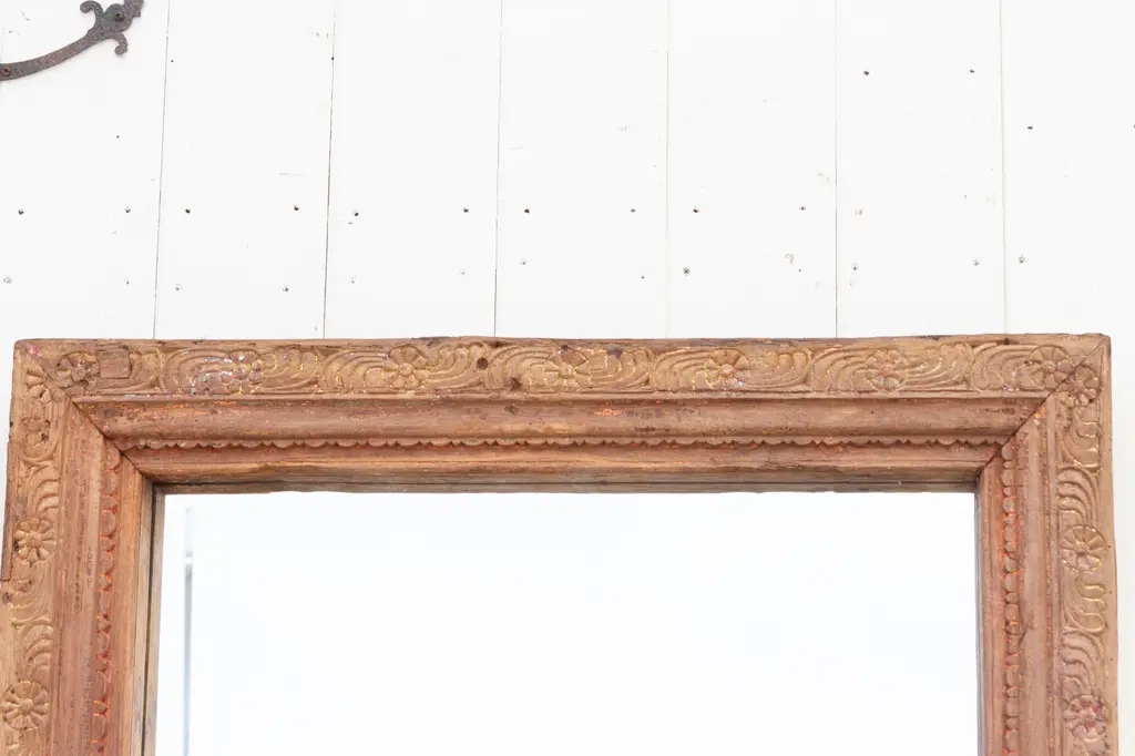 This exquisite antique window frame mirror is adorned with delicate filigree and tribal carvings all around the frame. It has a rustic naturally aged patina that preserves its charm and character. Reconstructed from an antique window frame found in an Indian haveli of Nawalgarg this mirror carries with it the stories and traditions of the past. This mirror is poised to transform any space with its rich heritage and timeless allure.