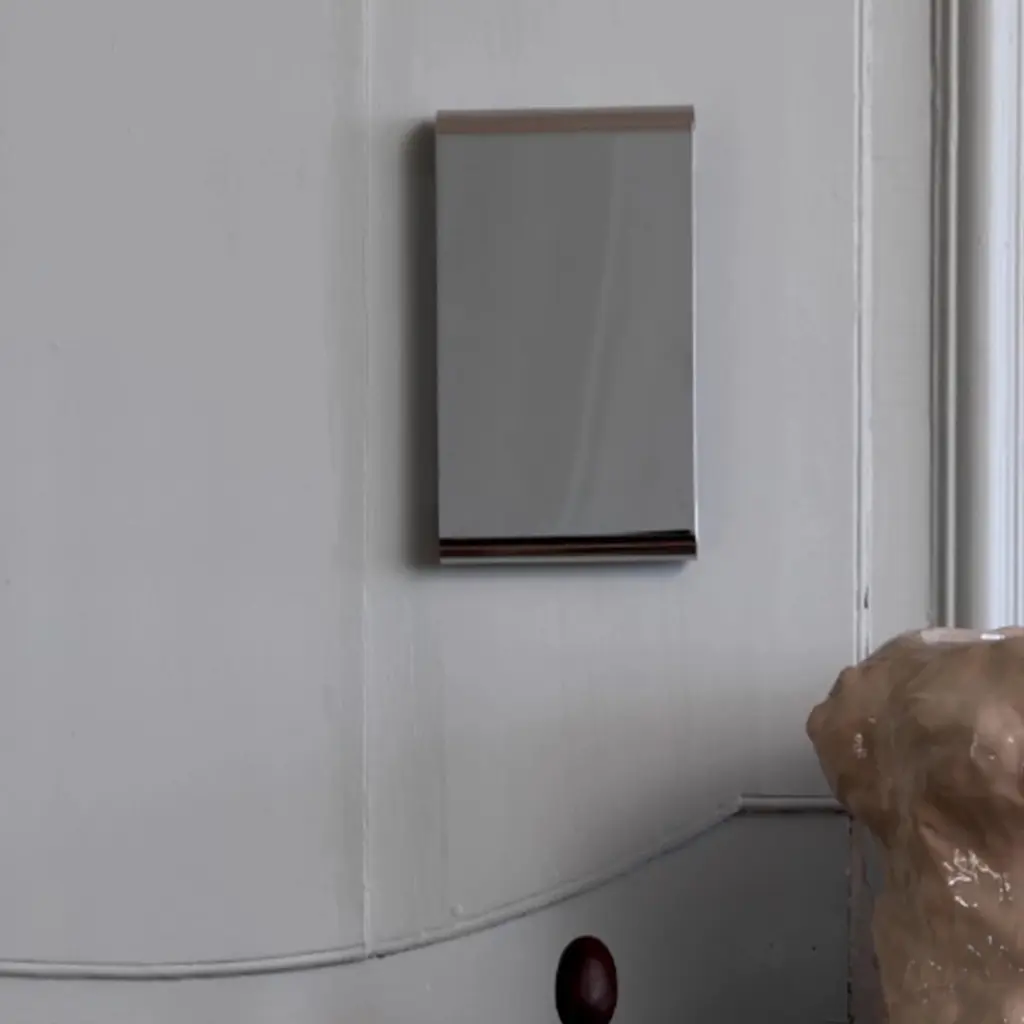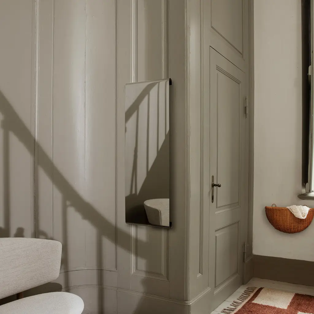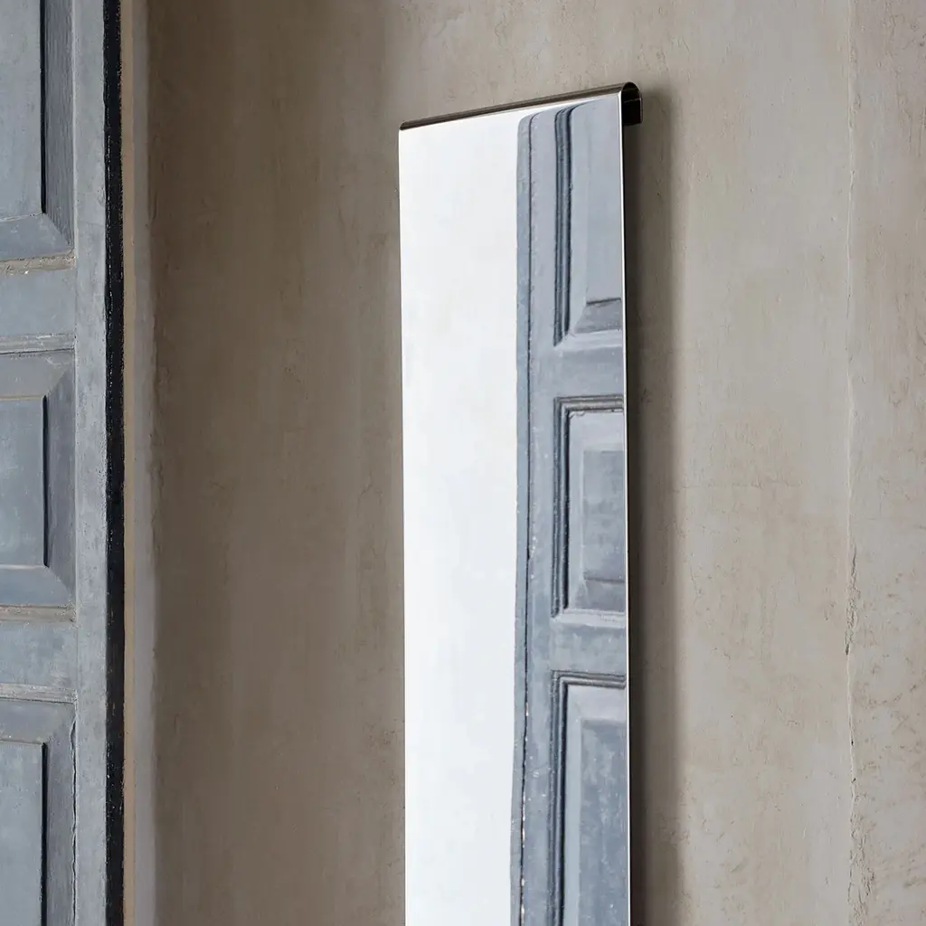 A modern mirror that looks like wall décor, the Ferm Living Tangent Mirror features curved edges that make it seem like it floats in mid-air. The simple but striking design offers more than a reflective surface that makes rooms appear larger. Indeed, Tangent creates subtle optical illusions with its bent edges, as reflections of people or objects at a distance of more than 1.5 meters appear slightly distorted at the top and bottom. Made from 304 stainless steel, this wall-mounted mirror boasts a sleek mirror polish. You can install it horizontally or vertically, in a living room, bedroom, or entrance hallway. The Ferm Living Tangent Mirror comes in two sizes, to suit any space. Please keep in mind that this mirror should always be fully supported at the back before installation to eliminate the risk of bending, which can cause reflections to appear distorted.