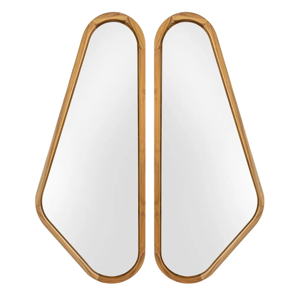 The Ali teak wood wall mirror by Studio + A! for Uultis embodies a perfect blend of lightness and elegance, bringing a touch of nature's beauty to any corner of your home. Named after the Italian word for ‘wings,’ the Ali mirror series is designed to evoke a sense of movement and freedom. When displayed together, the mirrors resemble soaring wings, creating a dynamic visual effect that enhances any decor. Crafted from high-quality teak wood, known for its durability and rich natural grain, each mirror features a solid wood frame, complemented by an MDF backing for added stability.Available individually or as a set, the Ali mirrors are a testament to Uultis' commitment to sustainable design, utilizing eco-friendly materials and responsible manufacturing practices. The warm teak wood finish offers natural variations, ensuring each mirror remains a unique work of art. The mirror for sale is the right one when they are displayed together, contributing to the distinctive wing-like shape. Fully assembled upon arrival, this mirror is ready to grace your living room, hallway, or bedroom, serving as a striking focal point or a complementary accent. Perfect for contemporary, minimalist, or organic modern interiors, the Ali wall mirror adds depth and elegance to any space, reflecting both light and artistic flair. Whether displayed individually or paired to create a wing-like silhouette, the Ali Teak Wood Mirror elevates your home with its timeless charm and versatility.