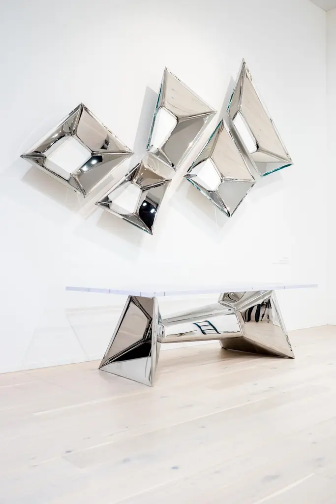 The Crystals wall mirror, Zieta (Set of 5)Dimensions: D27 x W 377 x H 183 cm.Material: Stainless steel.About the Gradient collection: The Gradient collection combines an exceptional depth and unparalleled reflections of the colorized surfaces. Soft transitions between colors provide the viewers intensive visual experiences. A change of point of view leads to a change in color perception.About Zieta: Zietas main goal is to deliver uniqueness and customization in design and constructions while keeping the production, transport and warehousing innovatively efficient.This is how they imagine the future world: Light, durable structures of customized applications produced on demand out of one-of-a-kind parts, yet efficiently.They use computer controlled production process. Customized pattern, customized form, customized function, one-of-a-kind product and outstanding precision are what they deliver.You will find all of this philosophy reflected in the products. They research, they discover new possibilities, they play with forms and they deliver a beautiful, innovative, surprising outcome to people who love design and who care about the design development.They believe their work is a valuable contribution to the world of design not only by the unique beauty of the forms but most of all by opening ultra-innovative opportunities of forming and new paths for the world of future.