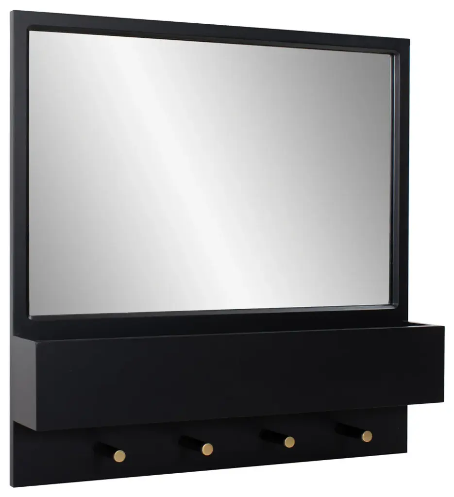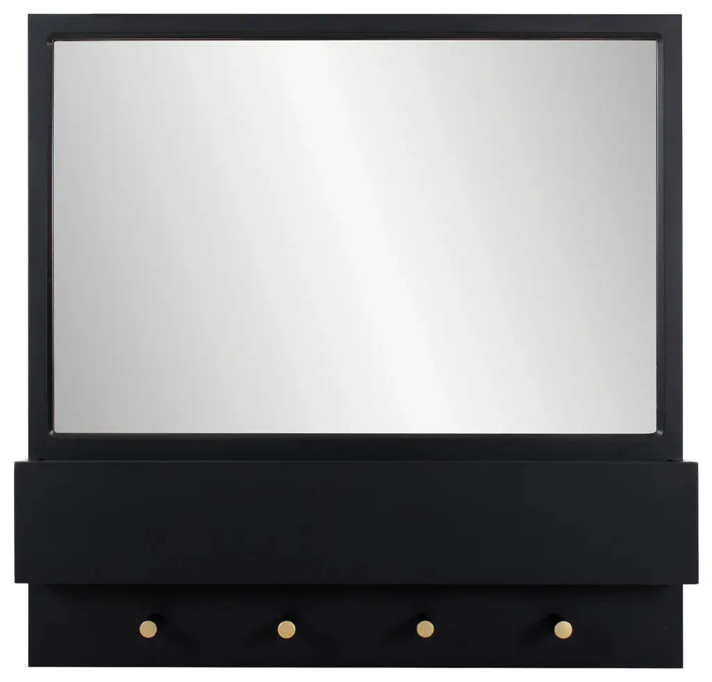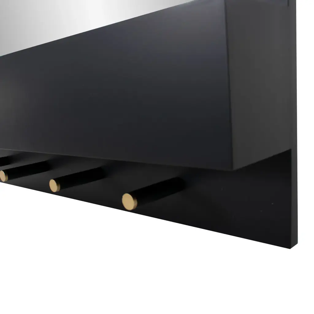 The Galt Wall Mirror was designed for todays busy lifestyle. The top mirror combined with a row of storagedrawers and the garment hooks completely answer all of our daily needs. Finished in matte black and accentedwith touches of brass colored hardware, the Galt Wall Mirror offers style and function that works into some of thehottest design trends.