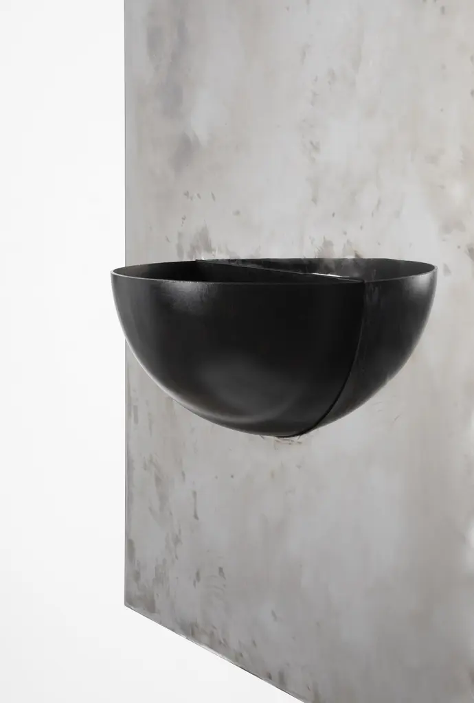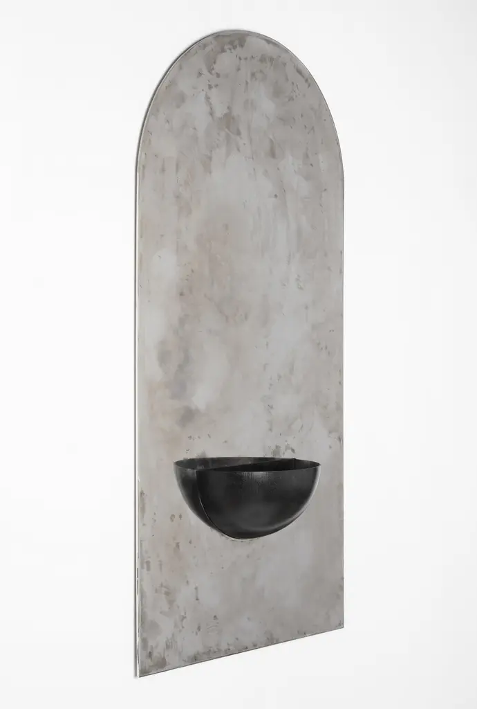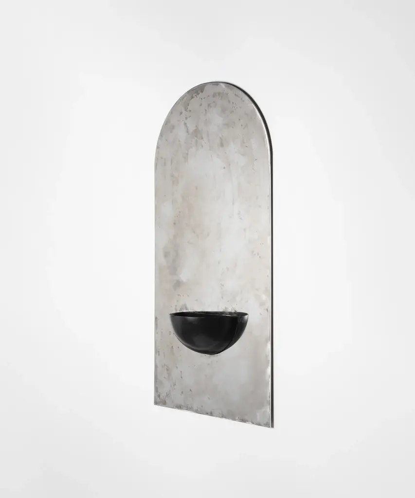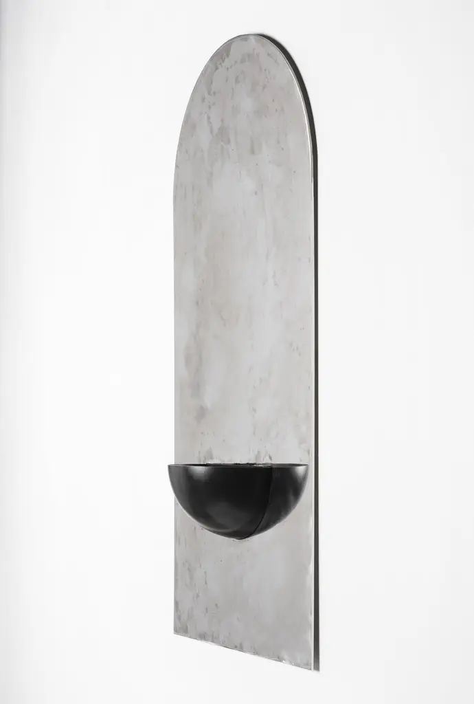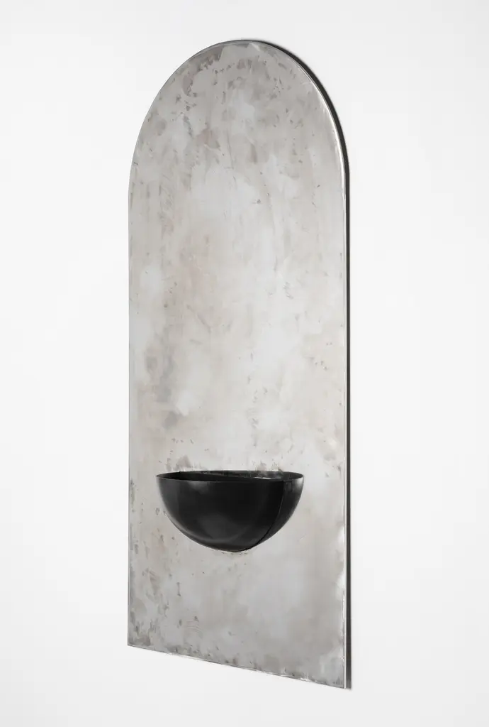 The Mirror of Simple Souls by CoseincorsoLimited Edition Of 15 + 2 A.P. Dimensions: D 16 x W 62,5 x H 124 cm.Materials: Hand-cut stainless steel and painted steel.Weight: 30 kg. The Mirror of Simple Souls takes inspiration from medieval stoups often found at the entrance of churches and by the Béguines’ beds. The stainless steel plate is brushed by hand leaving a blurry mirrored surface. The iron half-sphere can be used as a small container or be left as an empty spiritual vessel.COSEINCORSO is a multi-disciplinary design studio founded by Marzia Cerio and Marwann Frikach in 2021 specialized in objects and curation. Their practice is mainly focused on pushing forward the boundaries between art and design, using the combination of contemporary and minimalist aesthetics with traditional craftsmanship. Their approach aims to reintroduce poetics into the production process and highlights the cultural context in which objects are made. Their objects are made in collaboration with artisans and source local materials focusing on the valorization of know-how. Each collection is inspired by history, archaeology, and geography and aims to translate the essence of a region into physical form.In 2023, they launched their ephemeral gallery representing artists and designers that share the same values.