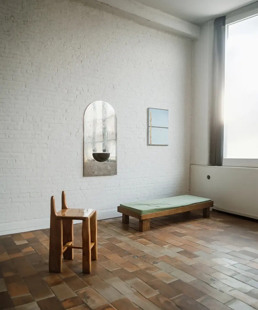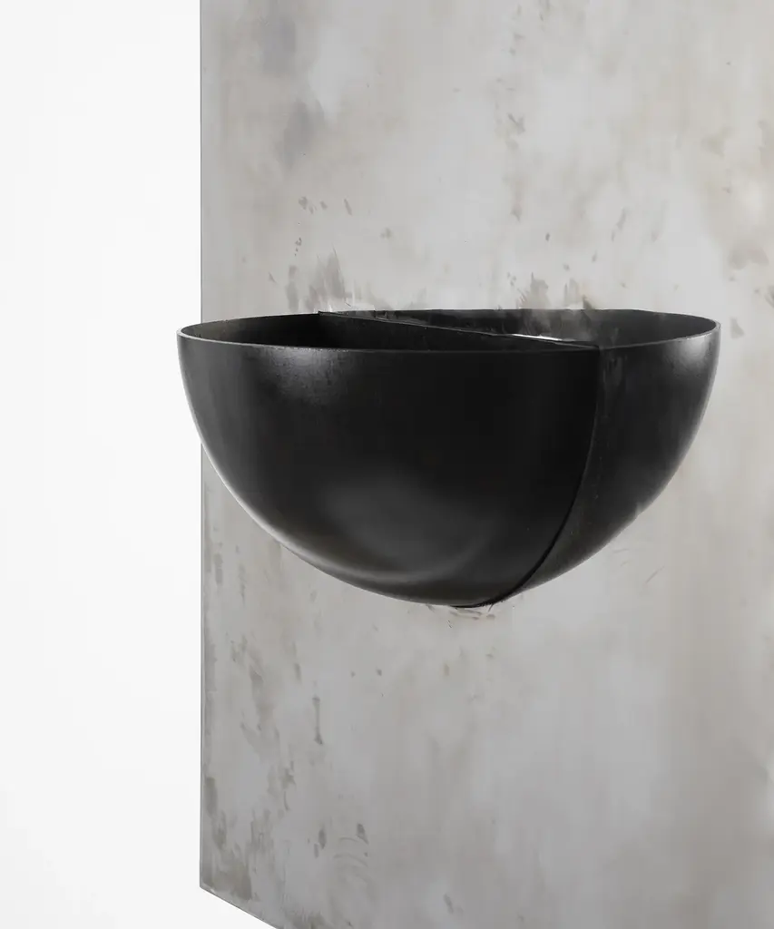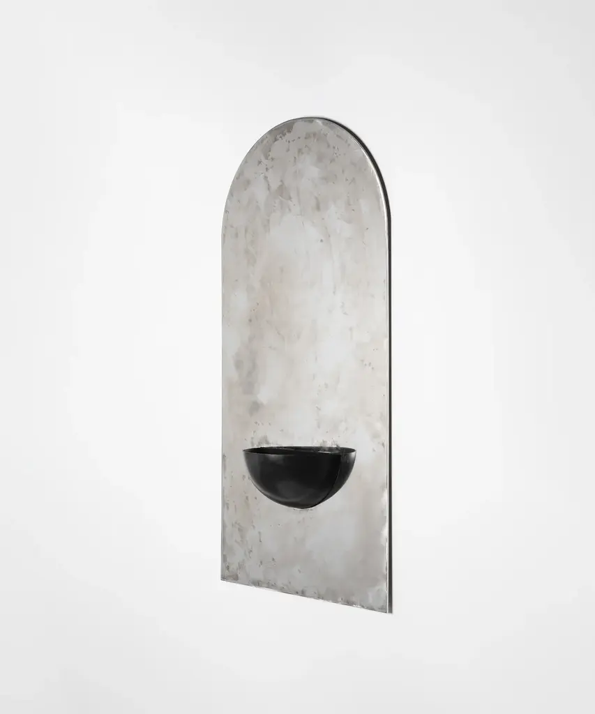 The Mirror of Simple Souls takes inspiration from medieval stoups often found at the entrance of churches and by the Béguines beds. The stainless steel plate is brushed by hand leaving a blurry mirrored surface. The iron half-sphere can be used as a small container or be left as an empty spiritual vessel.