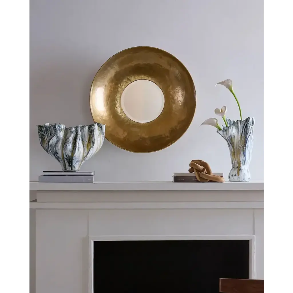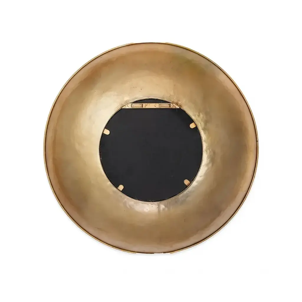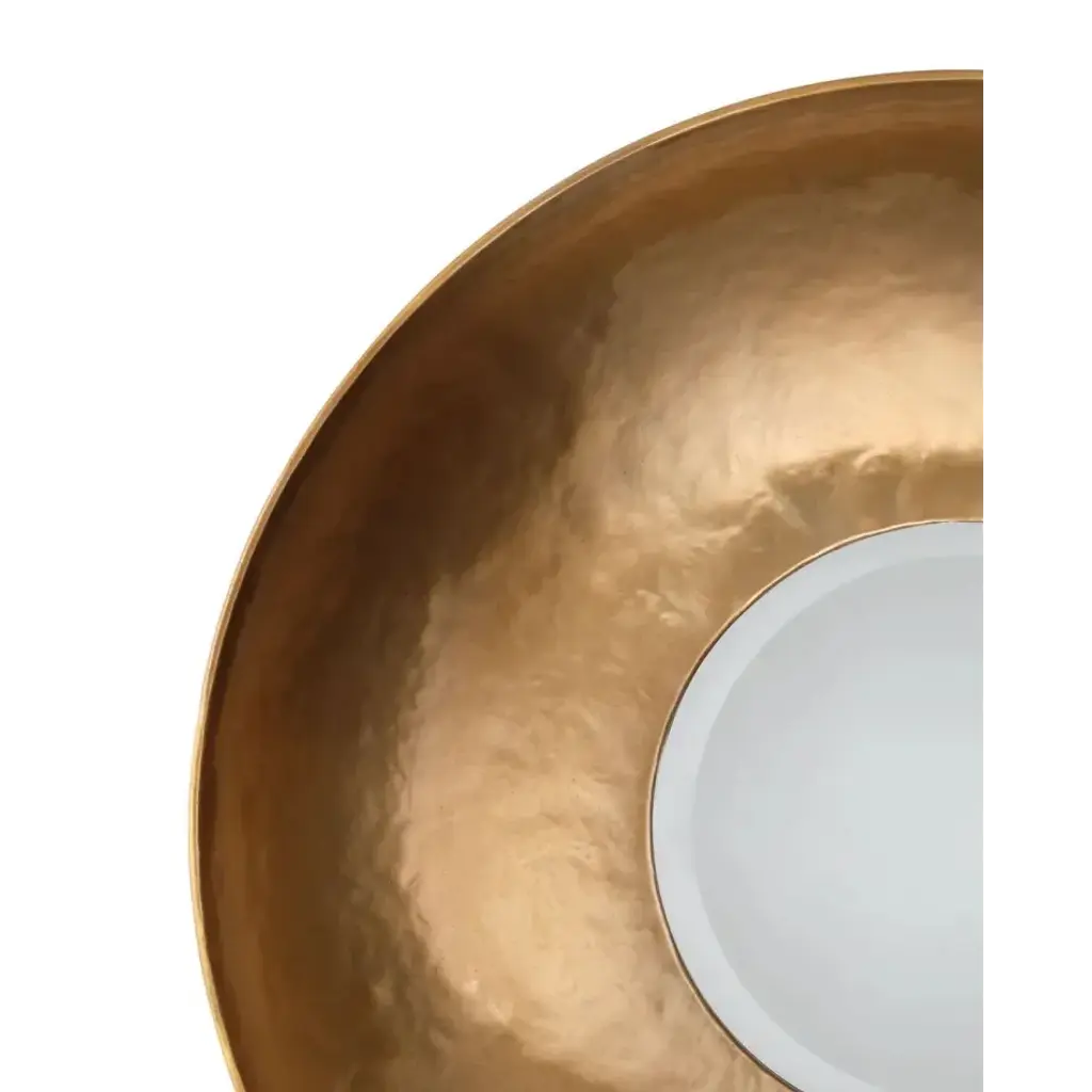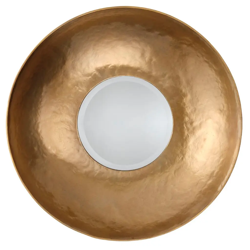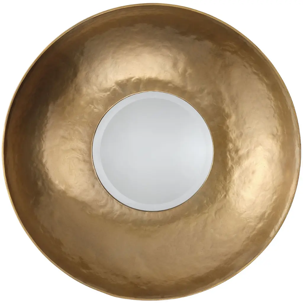 The design of this burnished gold disc evokes imagery as diverse as Trojan shields, Olympic gold medals, and Egyptian sun gods. The frame features a hand-textured, hammered gold finish, while the circular mirror inside is beveled. Hang several together for an eye-catching display, or place just one within a gallery wall for a reflective counterpoint to your cherished collections.
