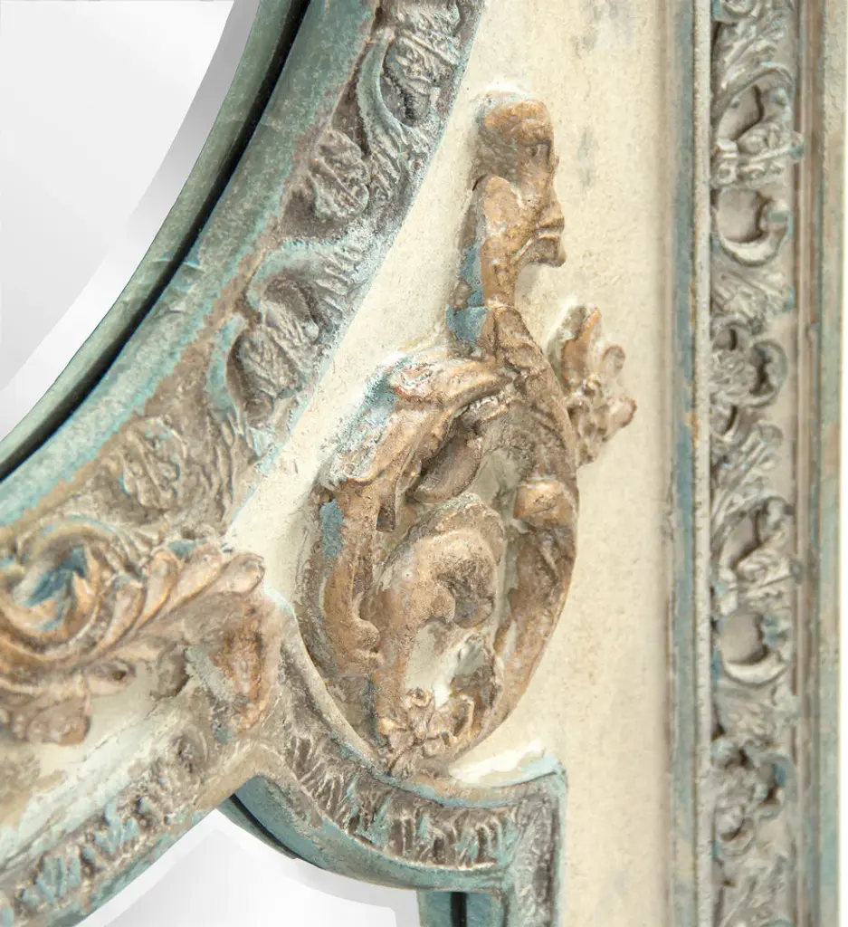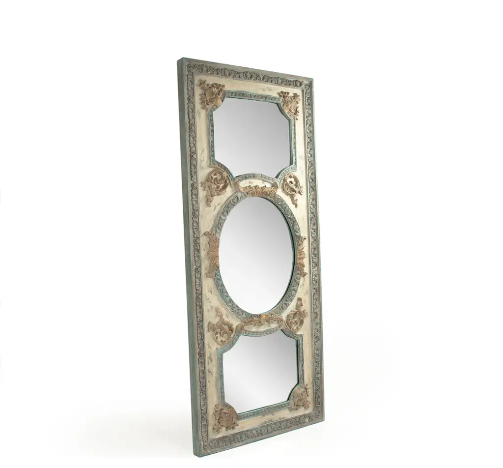 Mirror with oval centered mirror and curved mirror on each side with ornate French details in distressed sage green and antique cream finish.