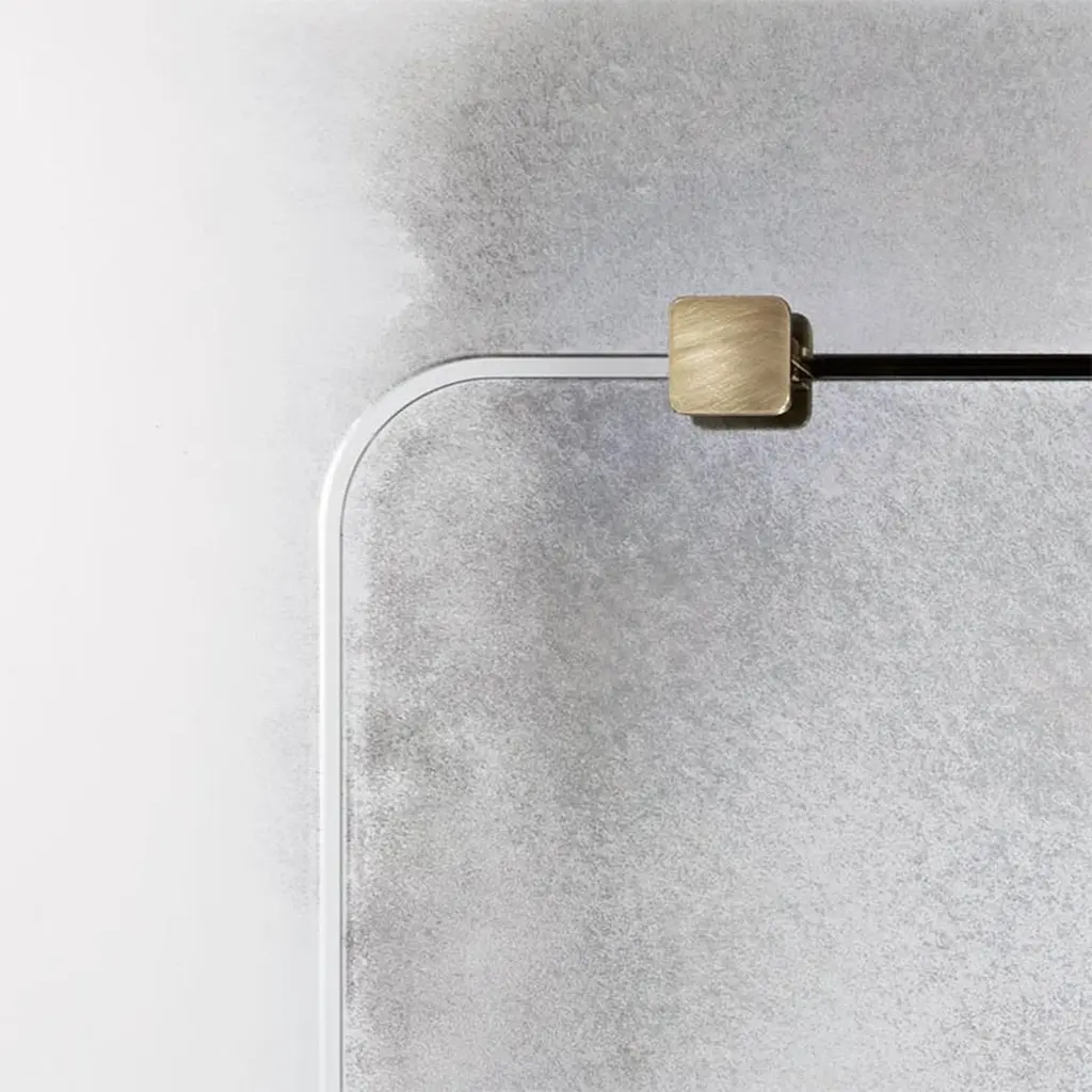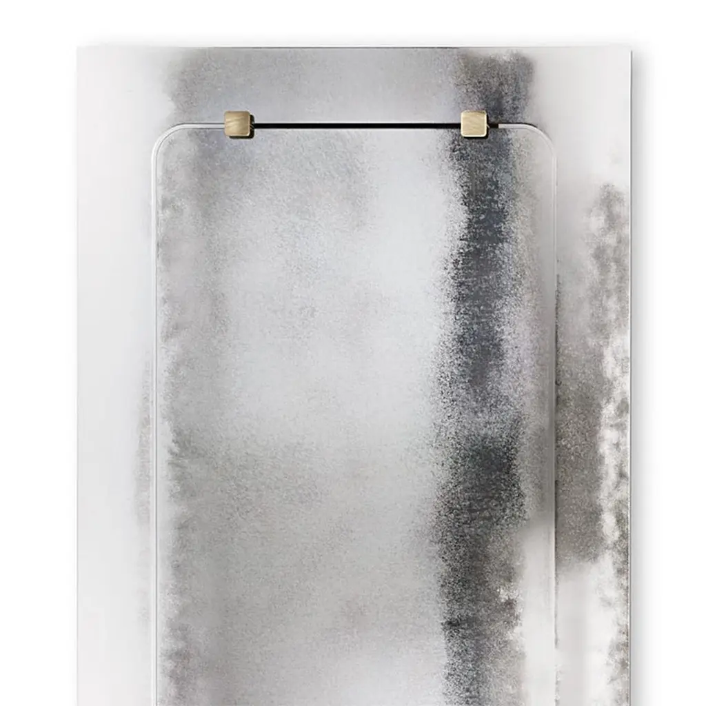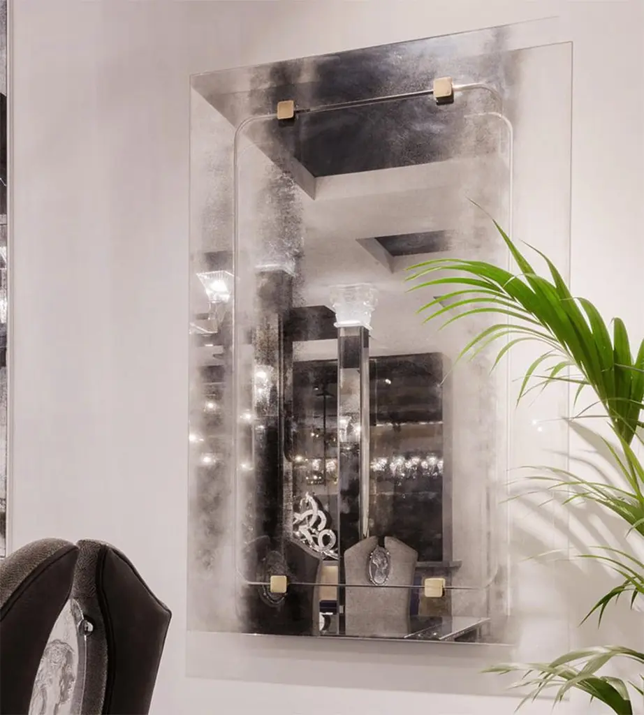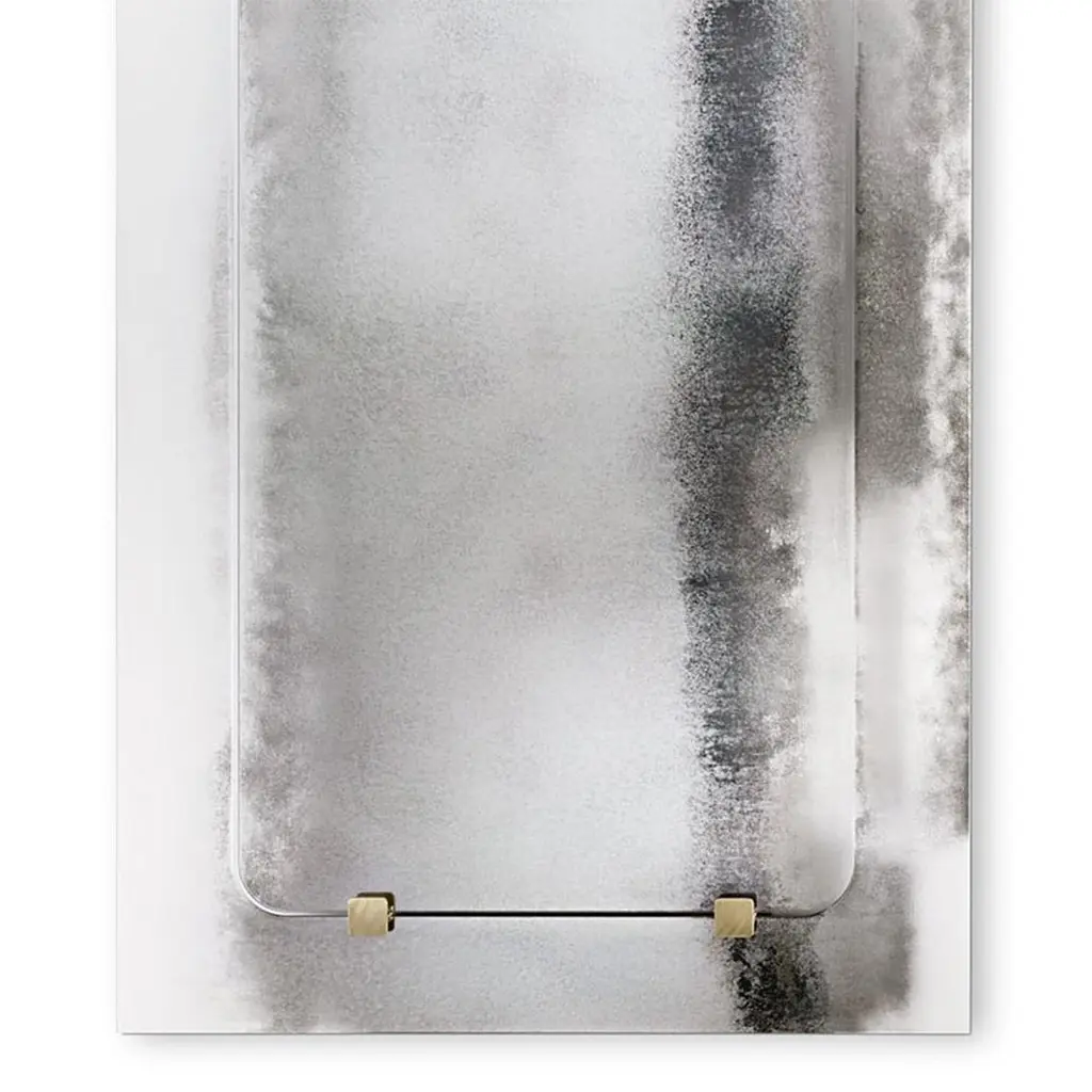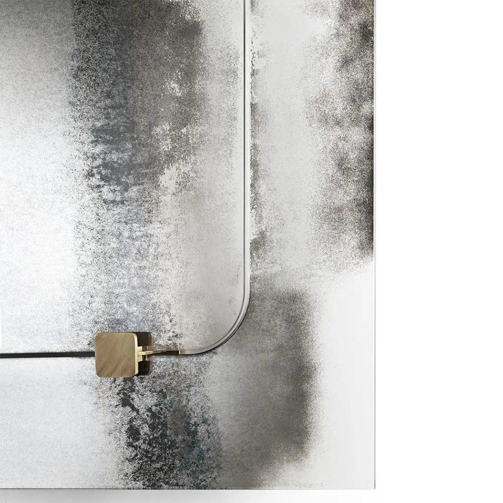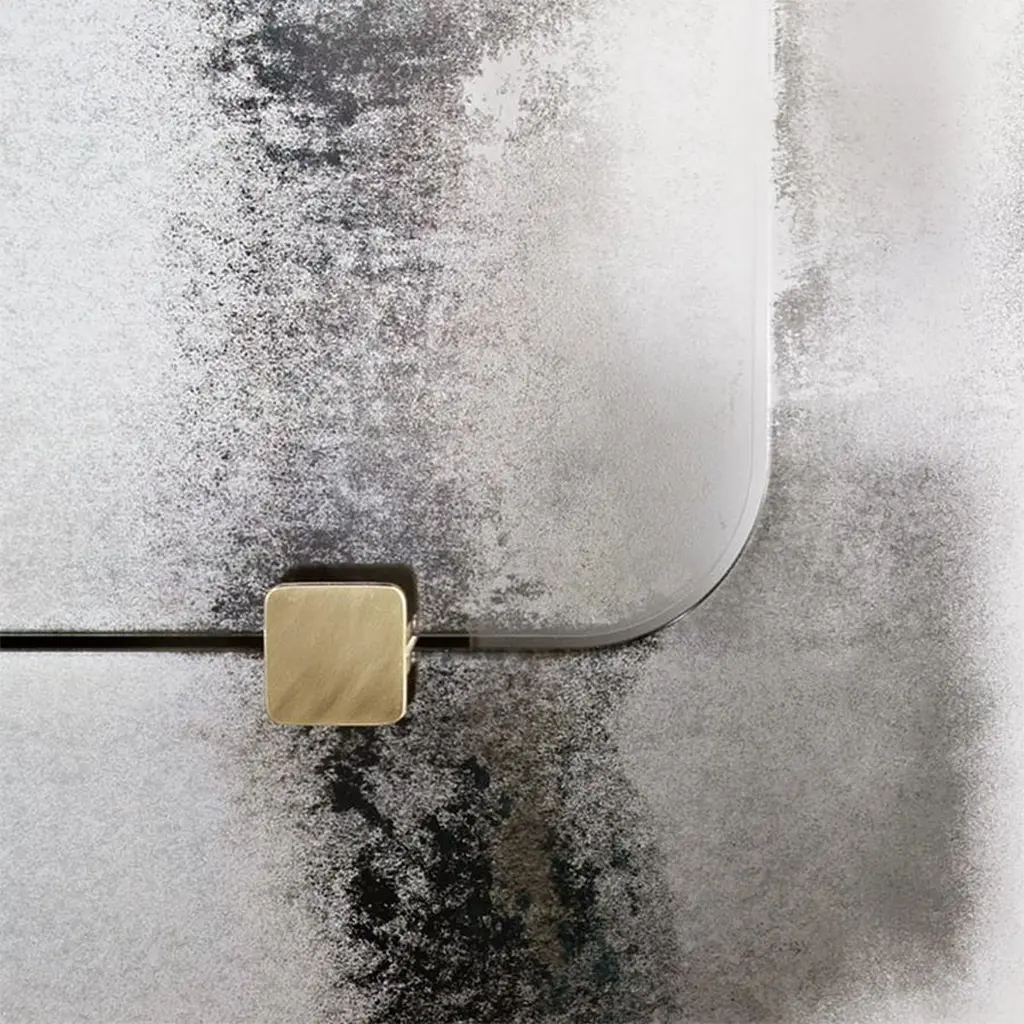 Mirror thunder with metal back structure with clear glass,mirror with heavy tones into clear antique gradient. Withantique brass finish squares on the mirror.