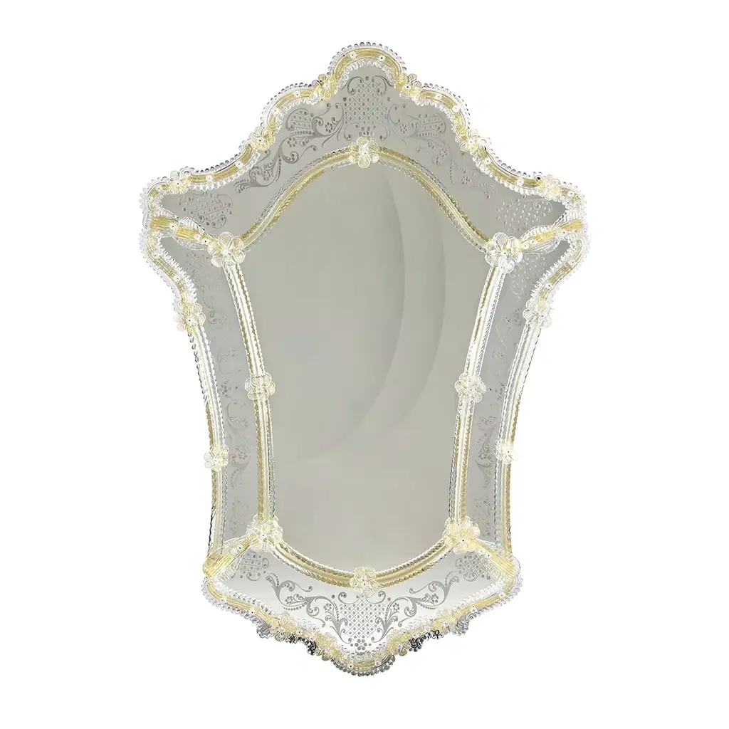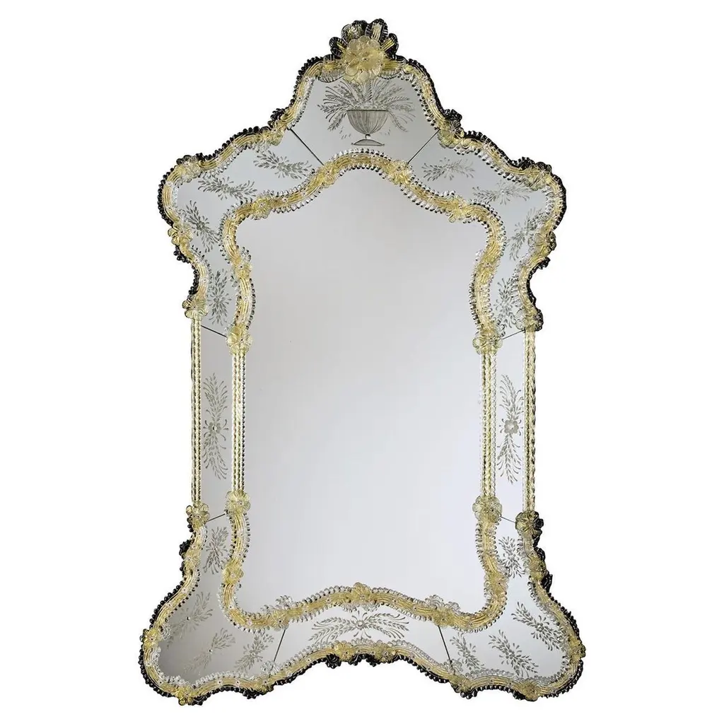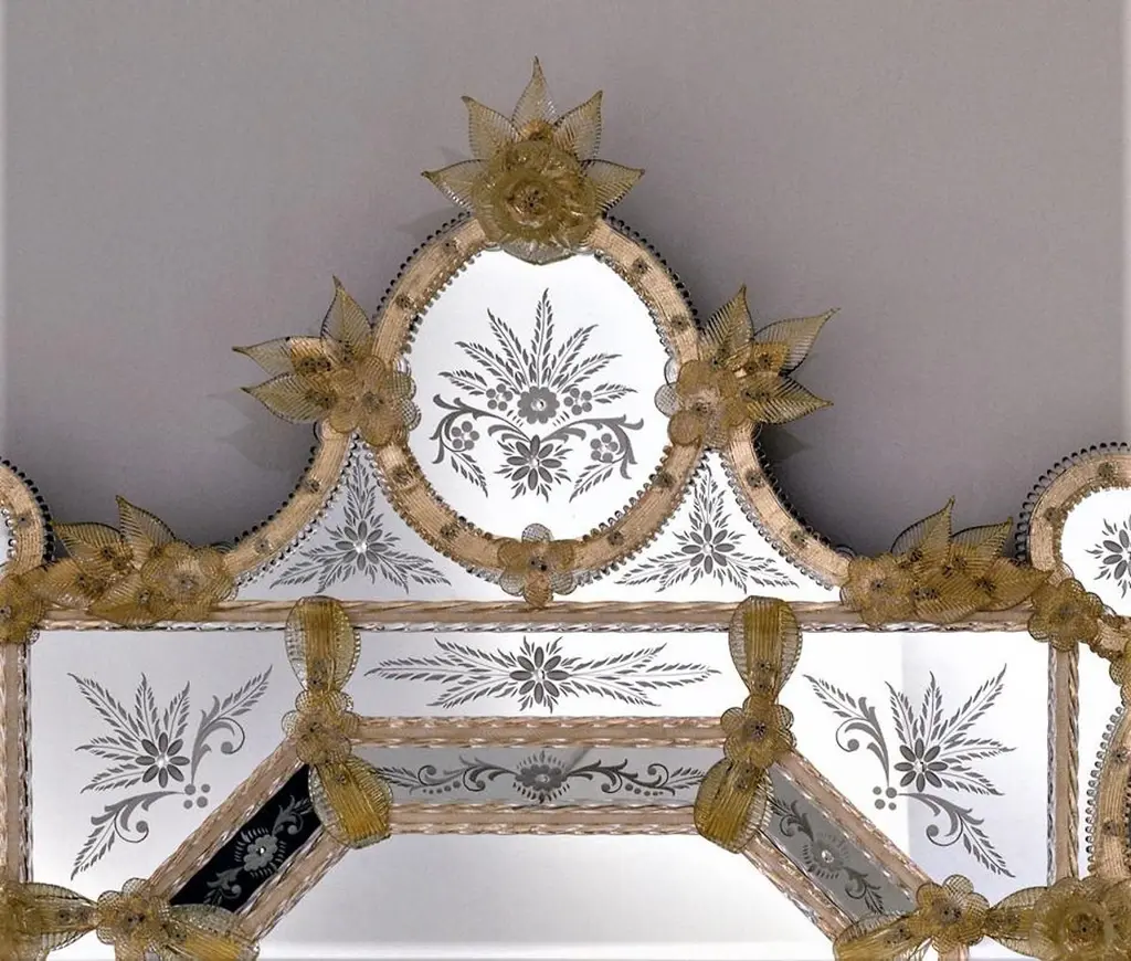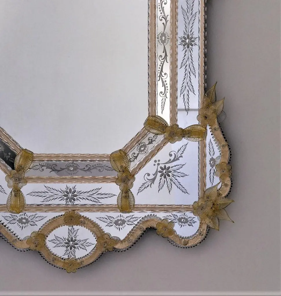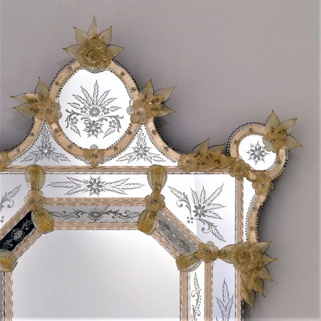 Venetian style mirror made to a design by Fratelli Tosi, in Murano glass, entirely hand made according to the techniques of the glass masters of the fourteenth century. the Mirror is composed of an external rectangle plus an internal octagon, with crests all around, decorated with floral engravings with curls, silvered with pure silver.The frame composed of reeds and crystal curls on a gold background embellished with flowers and leaves in Murano glass with gold leaf, made entirely by hand, still following the techniques and style of the glass masters of the fourteenth century, and the Tosi brothers makes a boast of excellence.