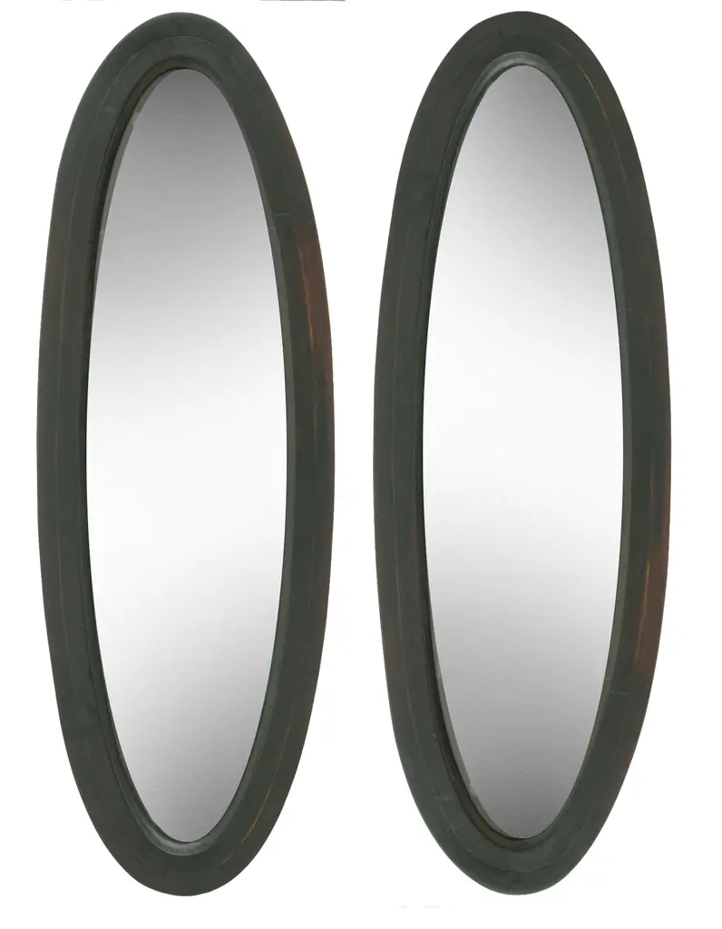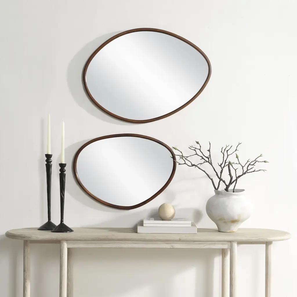 Double down on style with this beautiful duo of wall art mirrors when creating your next decorating scheme. Evoking a mid-century modern aesthetic that suits any contemporary interior, each mirror features a curvaceous shape thats emphasized by a dark and rich walnut-painted finish. 4-way hanging unlocks nearly endless display options, making this set a great pick for gallery walls or for creating a focal point.