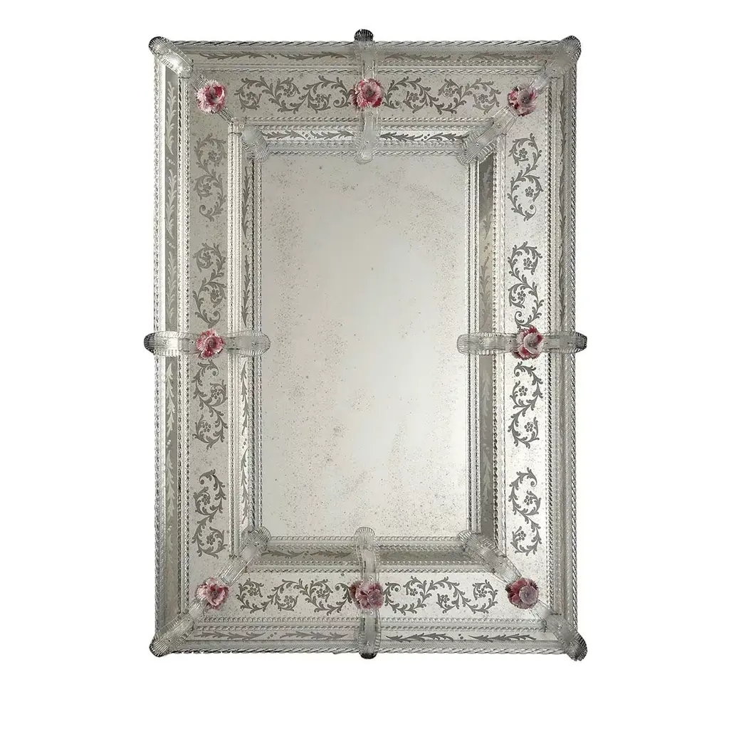 Venetian mirror with antiqued frame and carefully hand-engraved decorations according to the Murano tradition. All glass elements are finished with grinding on the edges. The mirror is assembled on a wooden frame with a natural finish.
