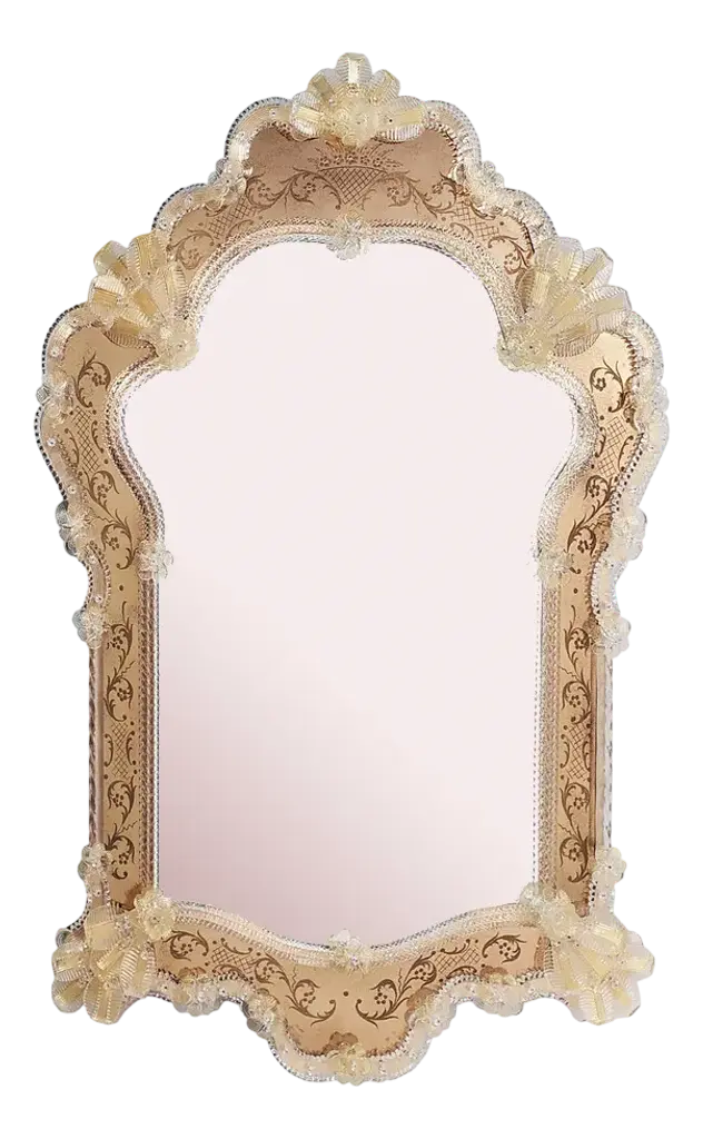 Venetian mirror made in the strictest Murano tradition with the center carefully hand-engraved. All assembled with crystal/gold elements handmade in the Murano furnaces. Wooden frame with a natural finish. Please contact the Concierge for further information.