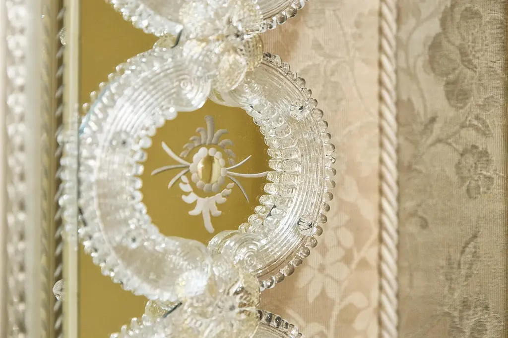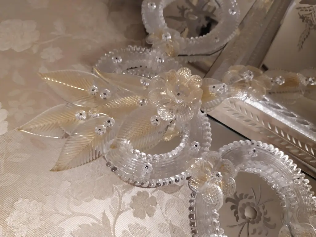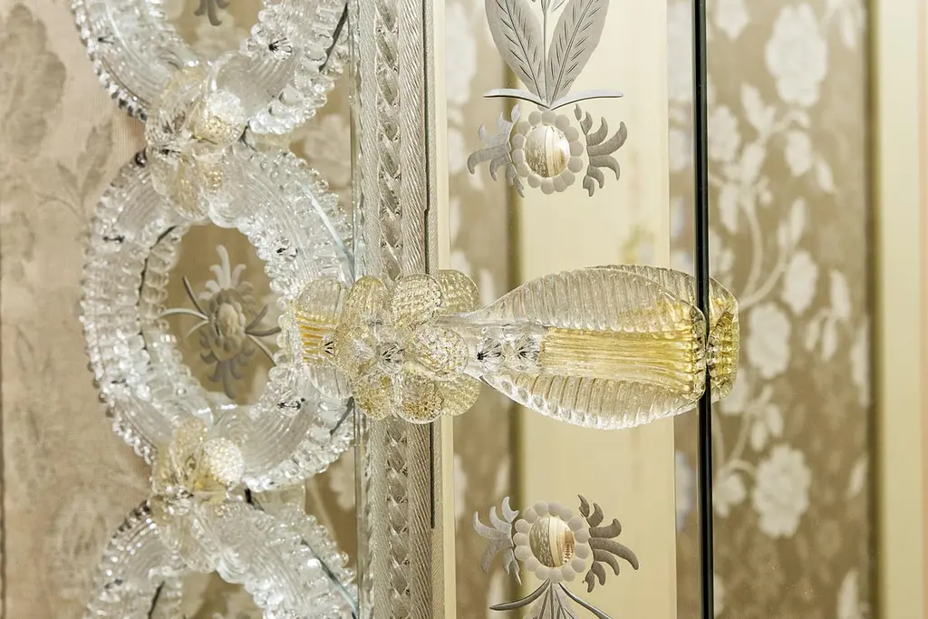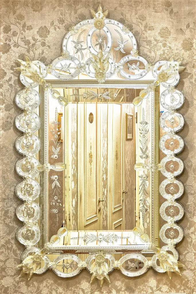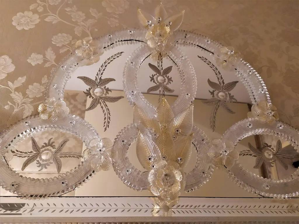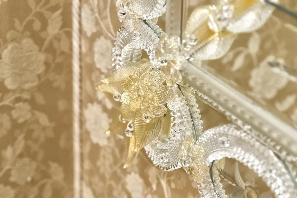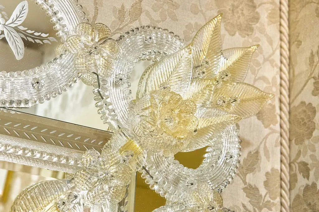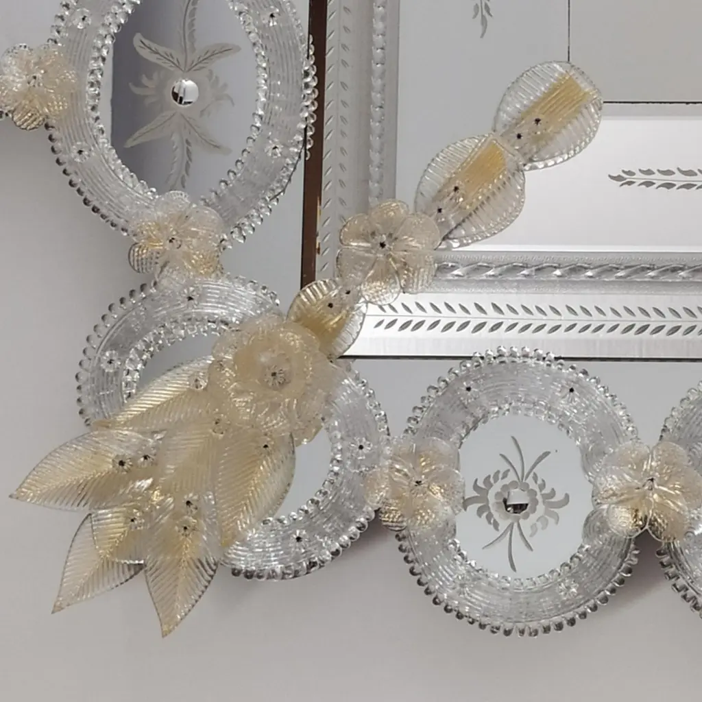 Luxurius Murano glass mirror in Venetian style, produced by Fratelli Tosi in the island of Murano in silver color with gold flower and leaves finishing, engraved, beveled and worked entirely by hand according to the Murano tradition, .A Luxurious mirror for luxury furnishings.