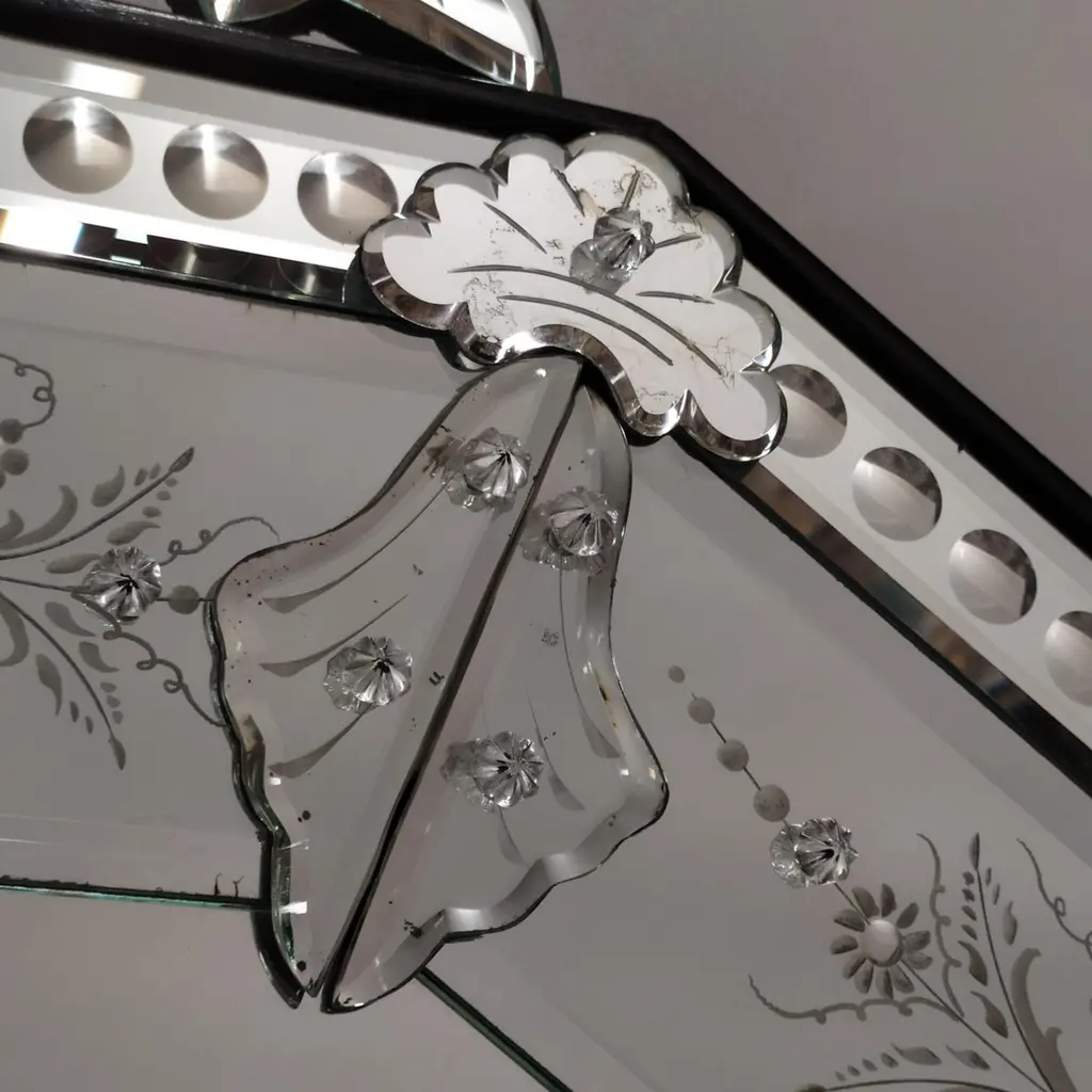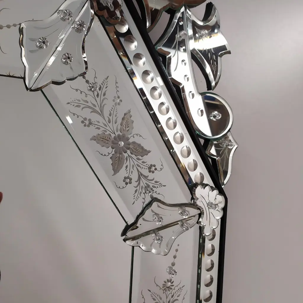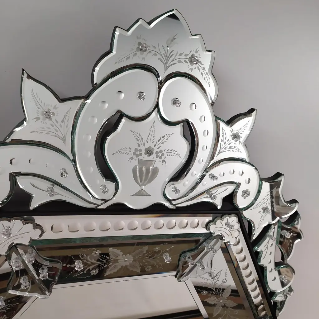 Luxurious mirror in Murano glass, in 19th century French style, made by Fratelli Tosi on the island of Murano, all bevelled, engraved. Carved and polished entirely by hand, the silvering in pure silver is still performed today following the ancient formulas of Venetian mirrors. The band that embraces the central mirror is carved with a floral subject, while the external one with a sequence of bubbles all silvering by hand, this to give brilliance and luminosity to this extraordinary mirror made in Murano - Italy.