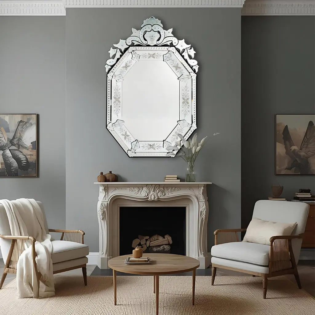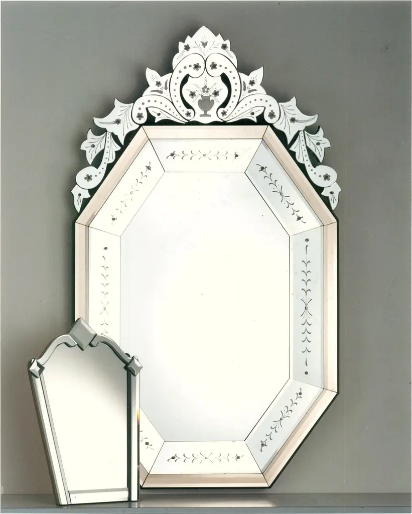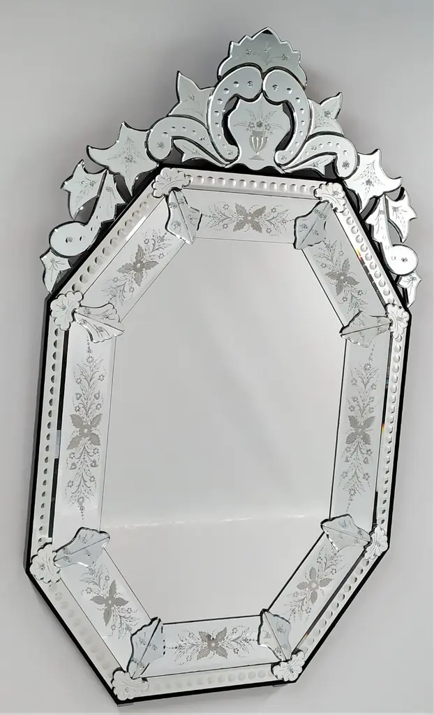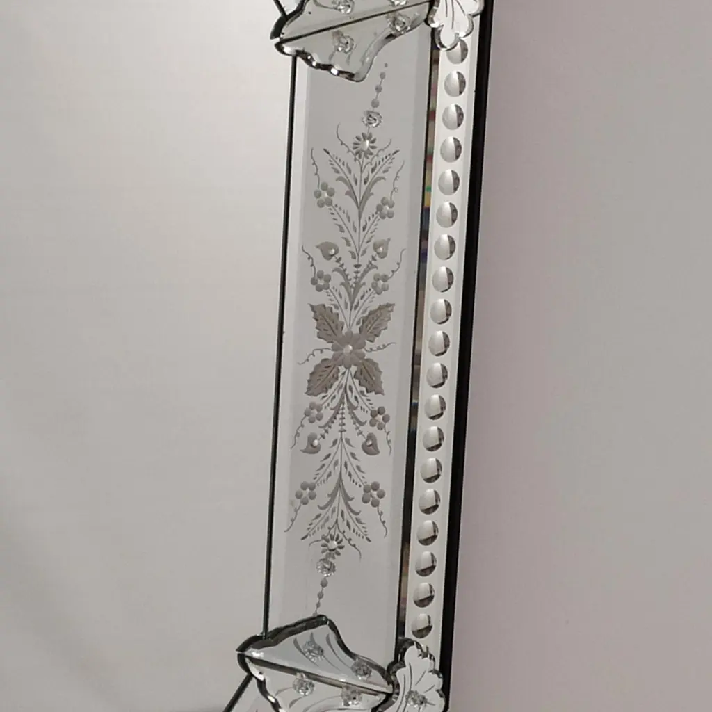 Luxurious mirror in Murano glass, in 19th century French style, made by Fratelli Tosi on the island of Murano, all bevelled, engraved. Carved and polished entirely by hand, the silvering in pure silver is still performed today following the ancient formulas of Venetian mirrors. The band that embraces the central mirror is carved with a floral subject, while the external one with a sequence of bubbles all silvering by hand, this to give brilliance and luminosity to this extraordinary mirror made in Murano - Italy.