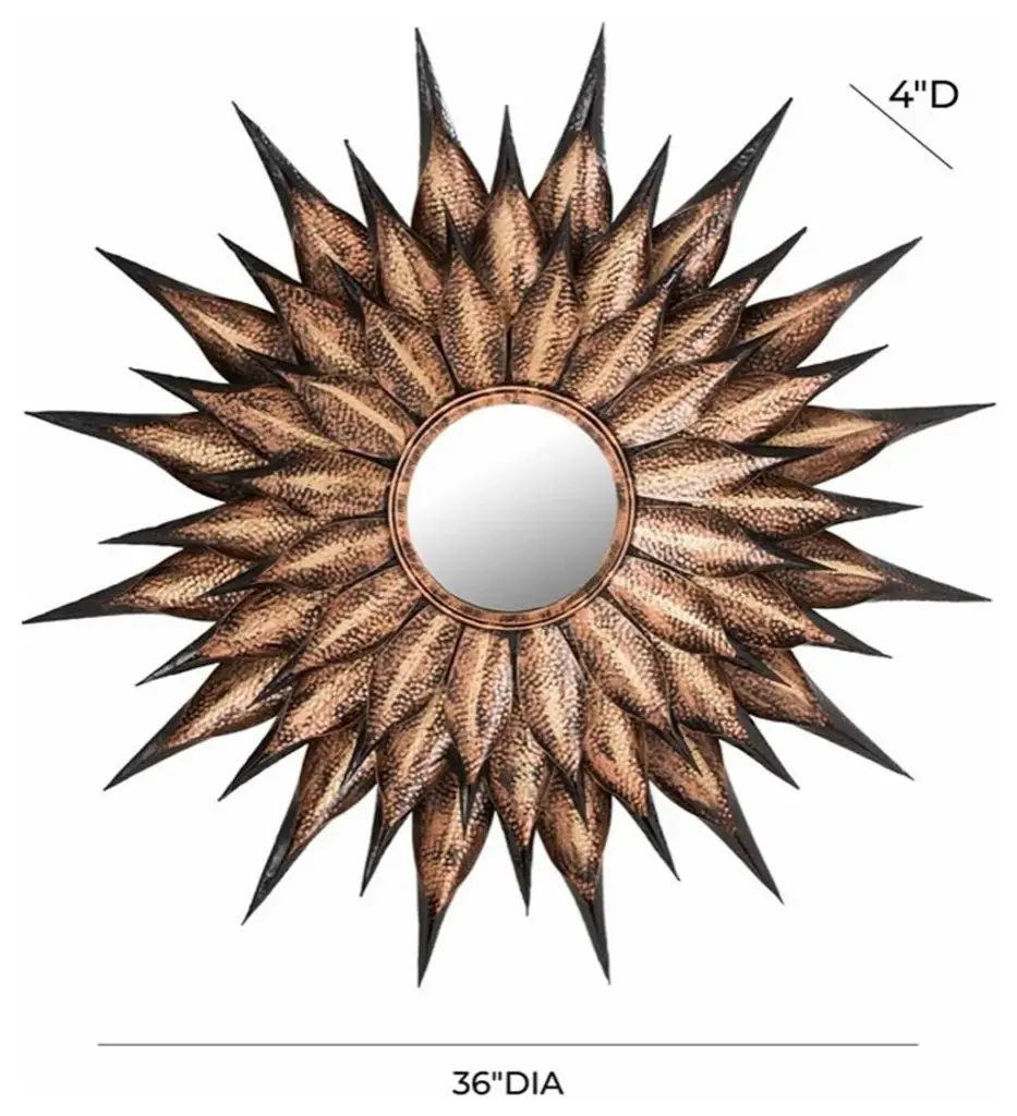 Bordered by tiers of antique brass petals, the sunflower mirror adds brightness and contemporay style to any space.• Handcrafted by master artisans • Dimensions: 36"W x 4"D x 36"H• Three tiers of antique brass petals• Ready to hang• Made in India