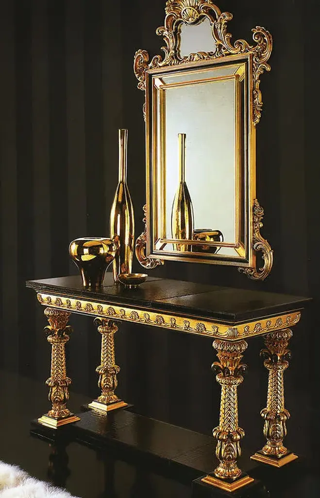 Handcrafted in Italy. Solid beech wood. Hand-carved. Beveled clear glass mirror. Shown in 24 Karat antique gold leaf finish with brown glaze.