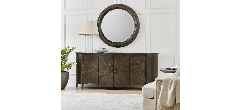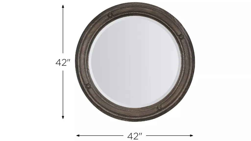 The Traditions round mirror has a rich brown with grey undertones. Distressing includes sandblasting, wormholes, chain distressing and rasping.