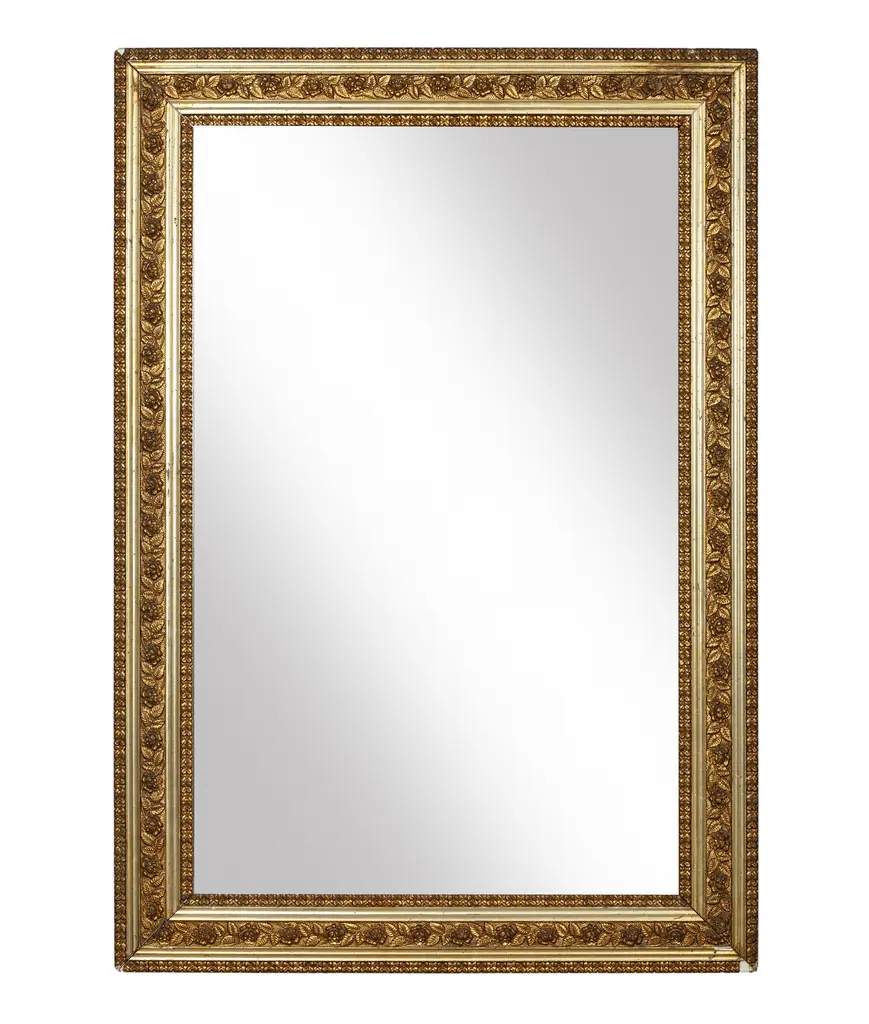 This superb framed mirror was hand carved on antique wood. Its simple rectangular frame is adorned with grape and flower patterns and its entire surface was gilded by hand with 22k pure gold over the dark background. The preparation to the gilding is made only with natural materials, such as rabbit-derived glue, isinglass, and gold-treated gypsum. The finishing in bronze is made with agate stone and an aged patina is applied at the end.
