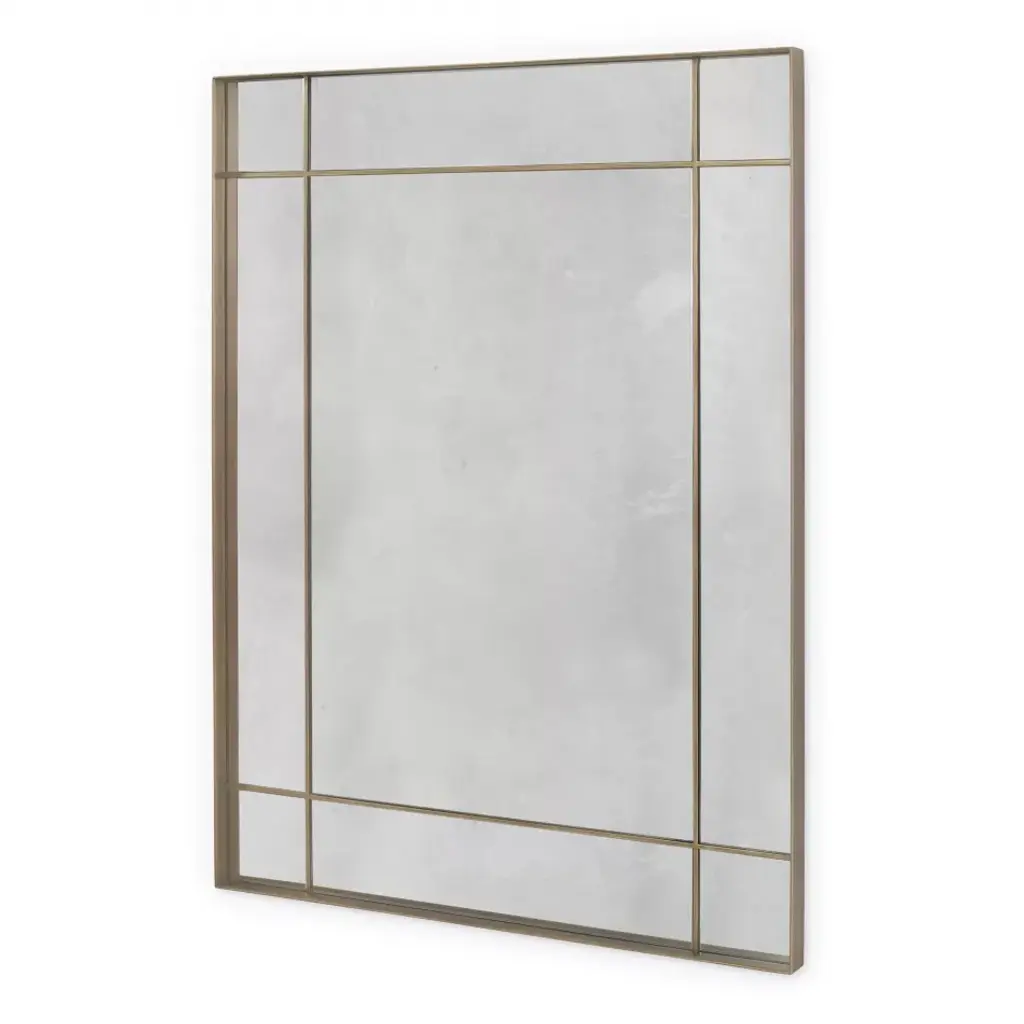 A thin antique brass frame surrounds a clear glass mirror. The brass frame segments the mirror to create a structured border. Includes a cleat for easy installation.