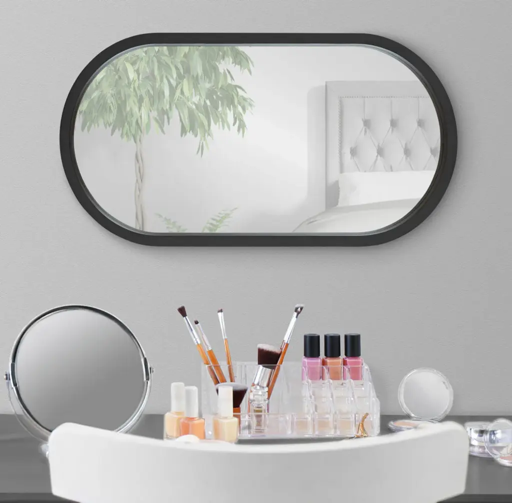 The Travis collection of sophisticated wall mirrors offers your home a new take on modern simplicity. Inspired by the bold geometry of contemporary design, the Travis wall mirror features a capsule-like, oval shape, produced with clean, sophisticated lines that arch at both ends. It''s constructed with a sturdy, yet resilient, wooden material, with a sleek black finish for the ultimate statement piece. The overall dimensions of this wall mirror are 12 inches wide by 24 inches high, making it the perfect size to stand out in multiples of two or three in a beautiful space. Or you can also hang it on its own to create an elegant focal point in any modern living room, entryway, or dining room. The Travis mirror also makes for a great bathroom mirror above a vanity or sink. Hanging a wall mirror expands your space by spreading light, thereby creating a more open, dimensional look. The Travis capsule mirror hangs both vertically and horizontally on your wall to blend into your decor seamlessly. Plus, it hangs in seconds with easy-to-use metal D-ring hangers attached to the back of the frame.• MODERN DESIGN: Inspired by minimalist geometry, this edition of our Travis mirror has a clean capsule oval shape and a slim frame, emphasizing the geometric shape and eliminating any visual noise within its display• QUALITY MATERIALS: The slim frame of the Travis capsule mirror has a sturdy, resilient wooden construction, providing a lasting accent that will hang in your home for years to come• LARGE SIZE: The overall display dimensions of this wall mirror are 12 inches wide by 24 inches tall, providing a bold, functional accent piece for any room of the home• VERSATILE: Use the contemporary aesthetic of the Travis mirror as a bold bathroom mirror for your powder room or hang it in multiples for a grand wall display in your living room or entryway• EASY TO HANG: This modern mirror hangs both vertically and horizontally in only a matter of seconds with convenient metal D-ring hangers securely attached to the back of the frame