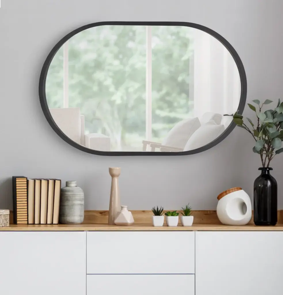 The Travis collection of sophisticated wall mirrors offers your home a new take on modern simplicity. Inspired by the bold geometry of contemporary design, the Travis wall mirror features a capsule-like, oval shape, produced with clean, sophisticated lines that arch at both ends. It''s constructed with a sturdy, yet resilient, wooden material, with a sleek black finish for the ultimate statement piece. The overall dimensions of this wall mirror are 20 inches wide by 30 inches high, making it the perfect size to stand out in multiples of two or three in a beautiful space. Or you can also hang it on its own to create an elegant focal point in any modern living room, entryway, or dining room. The Travis mirror also makes for a great bathroom mirror above a vanity or sink. Hanging a wall mirror expands your space by spreading light, thereby creating a more open, dimensional look. The Travis capsule mirror hangs both vertically and horizontally on your wall to blend into your decor seamlessly. Plus, it hangs in seconds with easy-to-use metal D-ring hangers attached to the back of the frame.• MODERN DESIGN: Inspired by minimalist geometry, this edition of our Travis mirror has a clean capsule oval shape and a slim frame, emphasizing the geometric shape and eliminating any visual noise within its display• QUALITY MATERIALS: The slim frame of the Travis capsule mirror has a sturdy, resilient wooden construction, providing a lasting accent that will hang in your home for years to come• LARGE SIZE: The overall display dimensions of this wall mirror are 20 inches wide by 30 inches tall, providing a bold, functional accent piece for any room of the home• VERSATILE: Use the contemporary aesthetic of the Travis mirror as a bold bathroom mirror for your powder room or hang it in multiples for a grand wall display in your living room or entryway• EASY TO HANG: This modern mirror hangs both vertically and horizontally in only a matter of seconds with convenient metal D-ring hangers securely attached to the back of the frame