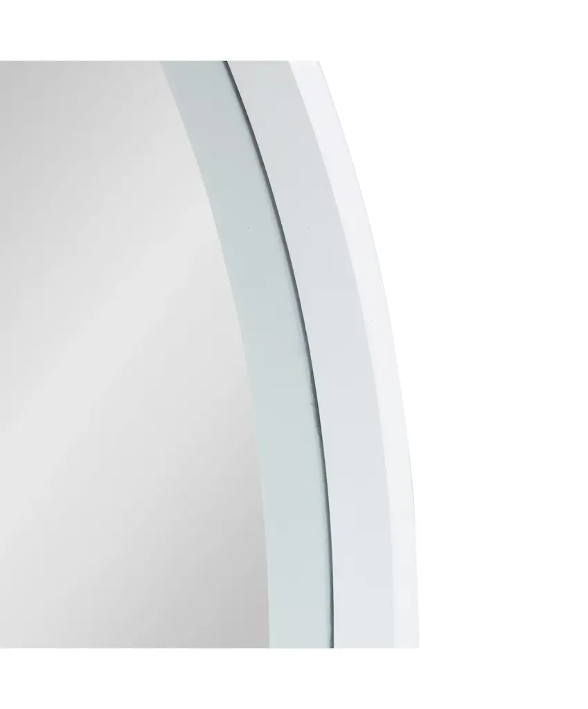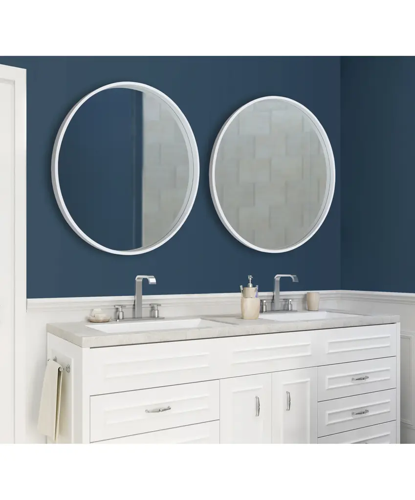 This decorative round wood mirror is a beautifully unique accent piece for your home decor. Hang this mirror above a fireplace, over a sofa, or above your bedroom headboard for a stunning wall accent. This mirror is also stunning as a vanity mirror. The reflective mirror surface has a 31-inch diameter. The outer dimensions measure 32 inches diameter and 1.5 inch depth from the wall. The mirror weighs 8 pounds. Two metal D-ring hangers with wire, are attached to the back of the frame for easy wall display. This gorgeous wood contemporary modern wall mirror piece will be the perfect fit in your existing decor theme in any room of the home!MODERN GEOMETRIC SHAPE: A circular wooden framed wall mirror with a white finish adds a soft contemporary look in your homeTRANSITIONAL STYLE: A practical piece, this mirror will work in your bedroom, living room, bathroom or any small to medium space you need to add a touch of styleTRANSITIONAL STYLE: A practical piece, this mirror will work in your bedroom, living room, bathroom or any small to medium space you need to add a touch of styleDURABLE MATERIAL: Mirror frame is constructed of a resilient manufactured wood with metal d-ring hangers with wire are attached for easy wall displayDECORATIVE YET FUNCTIONAL: A well placed mirror will enhance and lighten a space and is easily featured above a vanity or desk, fireplace, or sofa for extra brightness with a charming touch