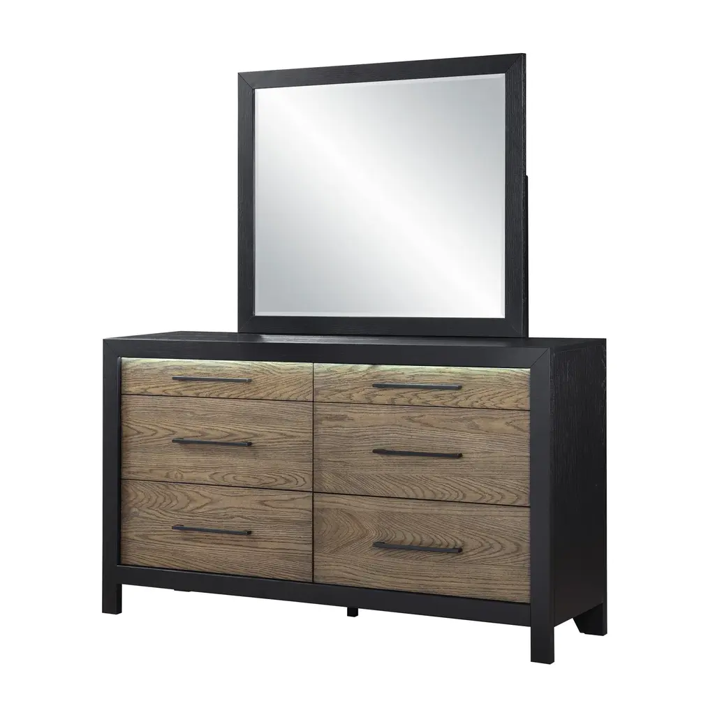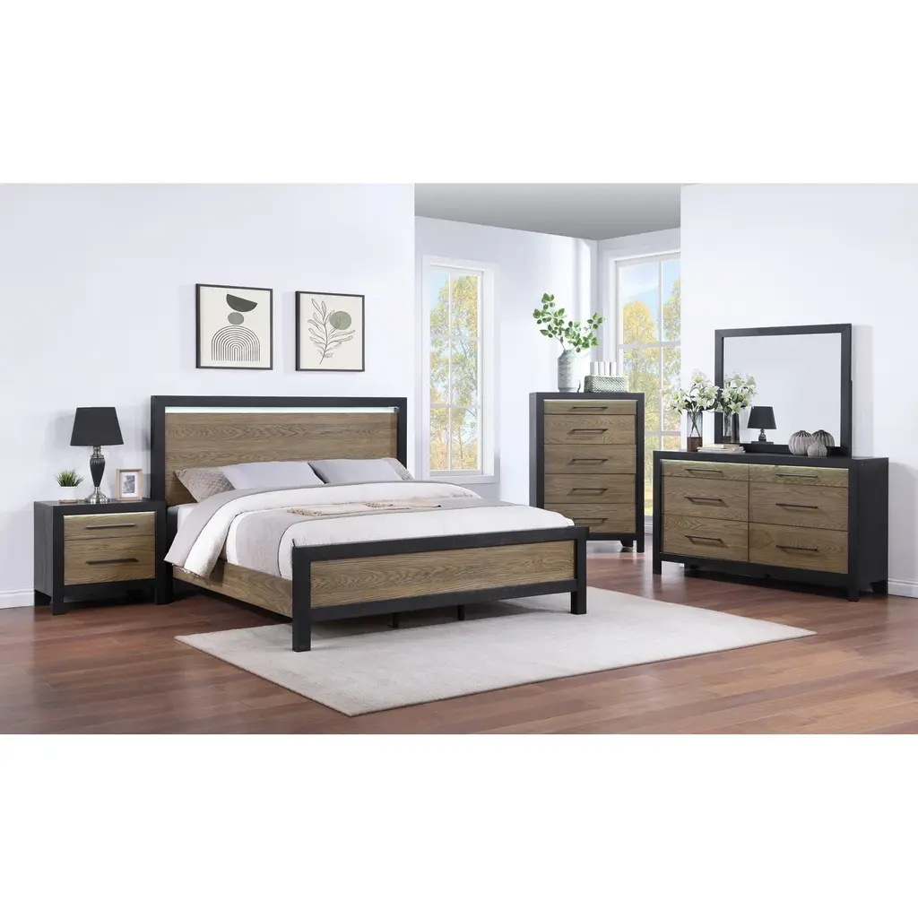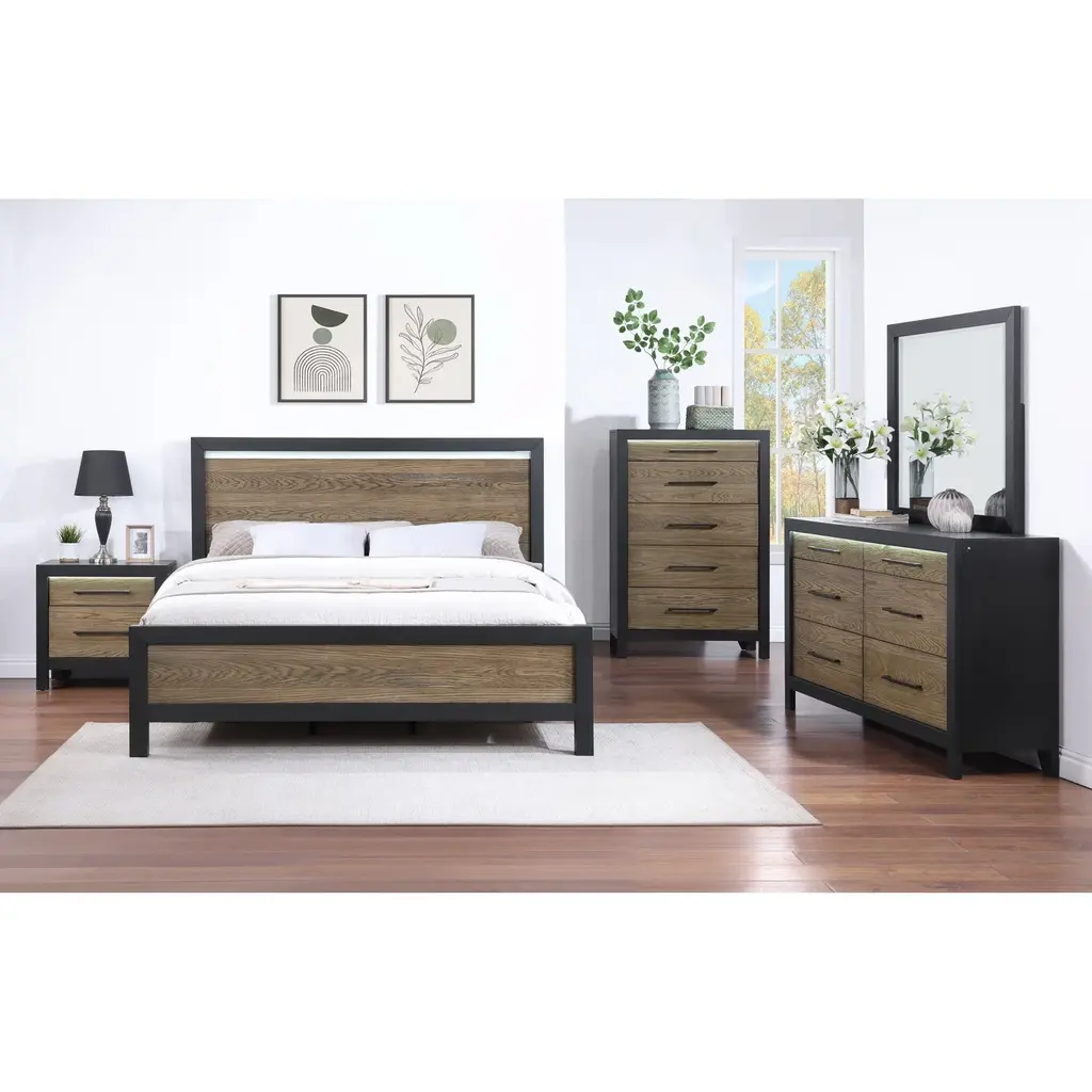 With its distinct grain patterns and modern rustic two tone look, this bedroom set is sure to update any bedroom space. Timeless sleek hardware and mood lighting on all the case pieces will create a relaxing sanctuary in your bedroom. - Product Details provided by Manufacturer, Slumberland not responsible for errors in information.