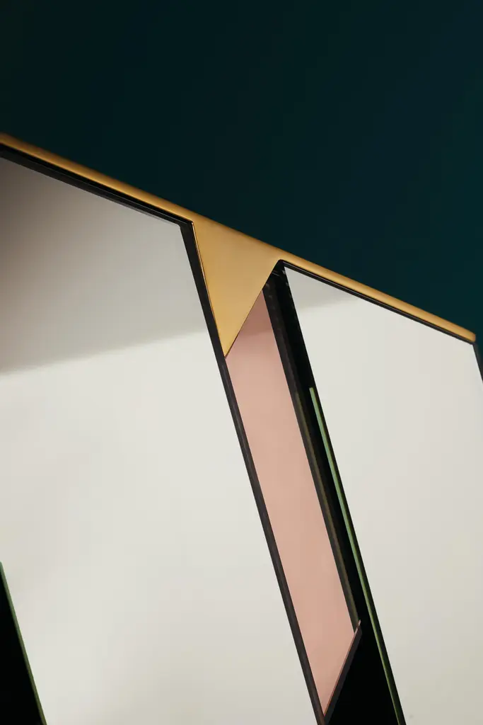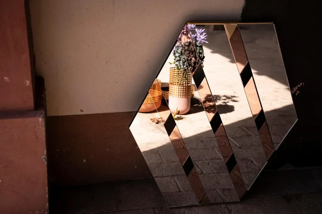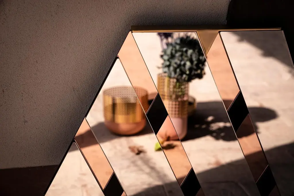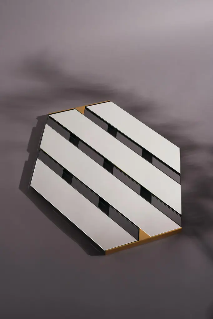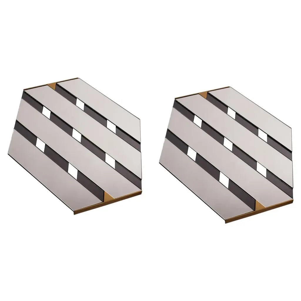 Pair of Tresse mirrors by Mason Editions Dimensions: 15 x 15 x 31 cm Materials: Glass and metal Diagonal bands of reflecting surface, which overlap in an elegant optical effect with as many bands of colored mirror: this hexagonal mirror recalls the most Classic of bon ton hairstyles.