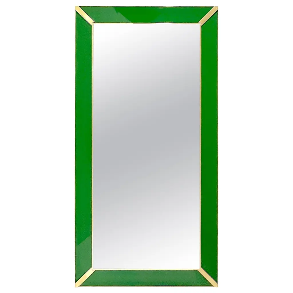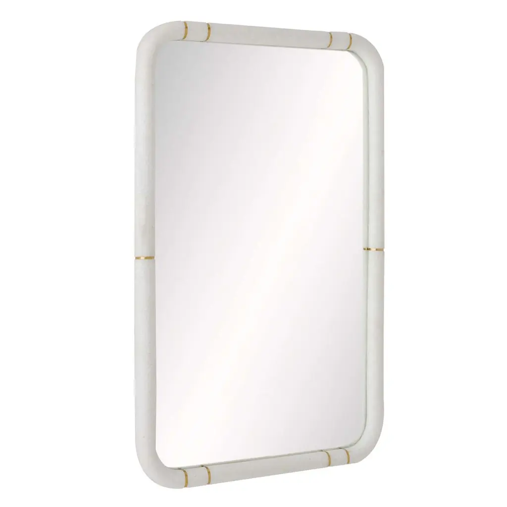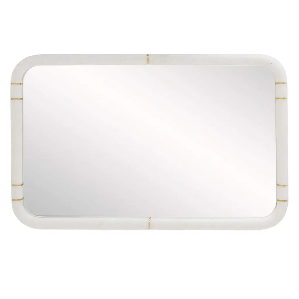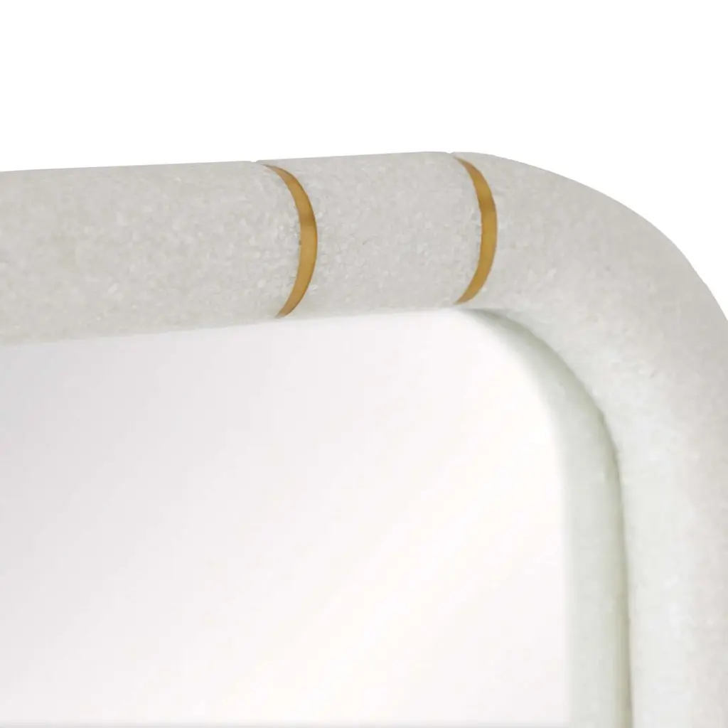 Exuding a modern elegance, the Trevino is created in a glistening ivory ricestone composite with antique brass steel inlays that wrap around the mirror’s bullnose edge. The piece can be hung vertically or horizontally and is fitted with a security cleat. Finish will vary.