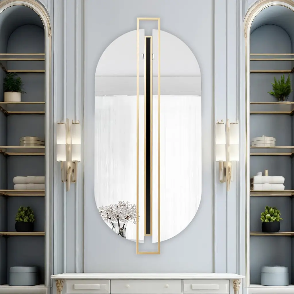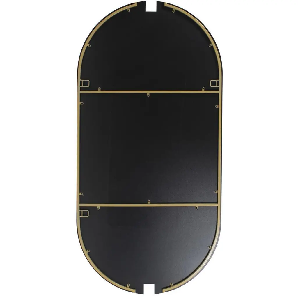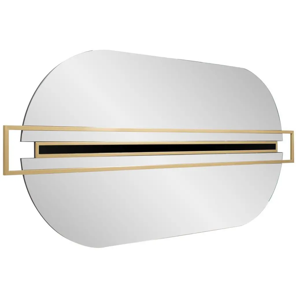 A truly unique statement piece that defies conventional design. With its frameless design and versatile hanging options in both vertical and horizontal orientations, this mirror offers endless possibilities for styling. The oval shape is complemented by a rectangular brushed gold piece in the middle, creating the illusion of two half-oval pieces connected together. This distinctive feature gives the mirror a striking appearance, reminiscent of a cave between the two halves.