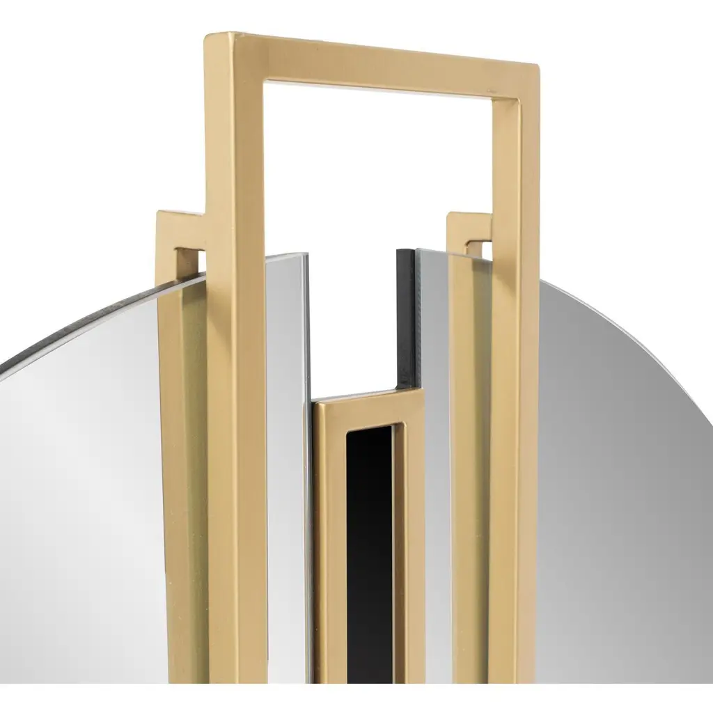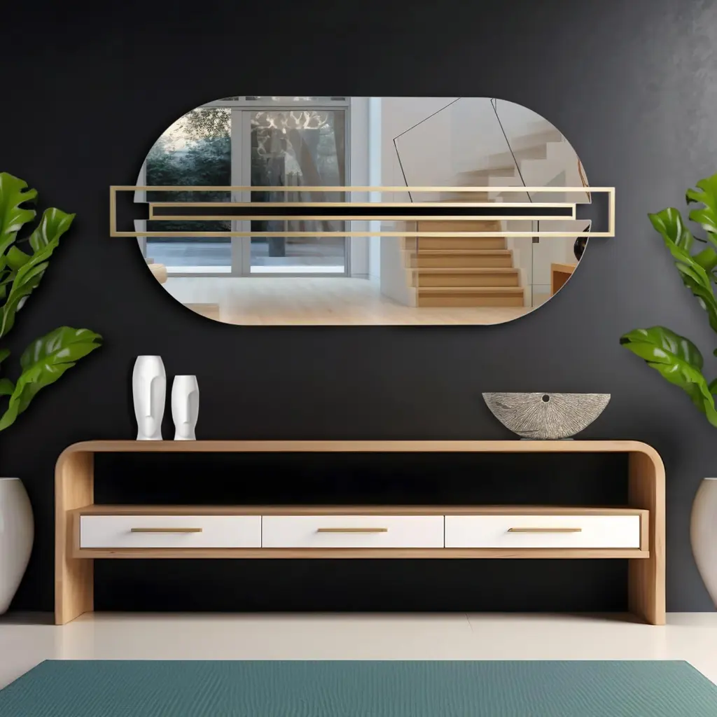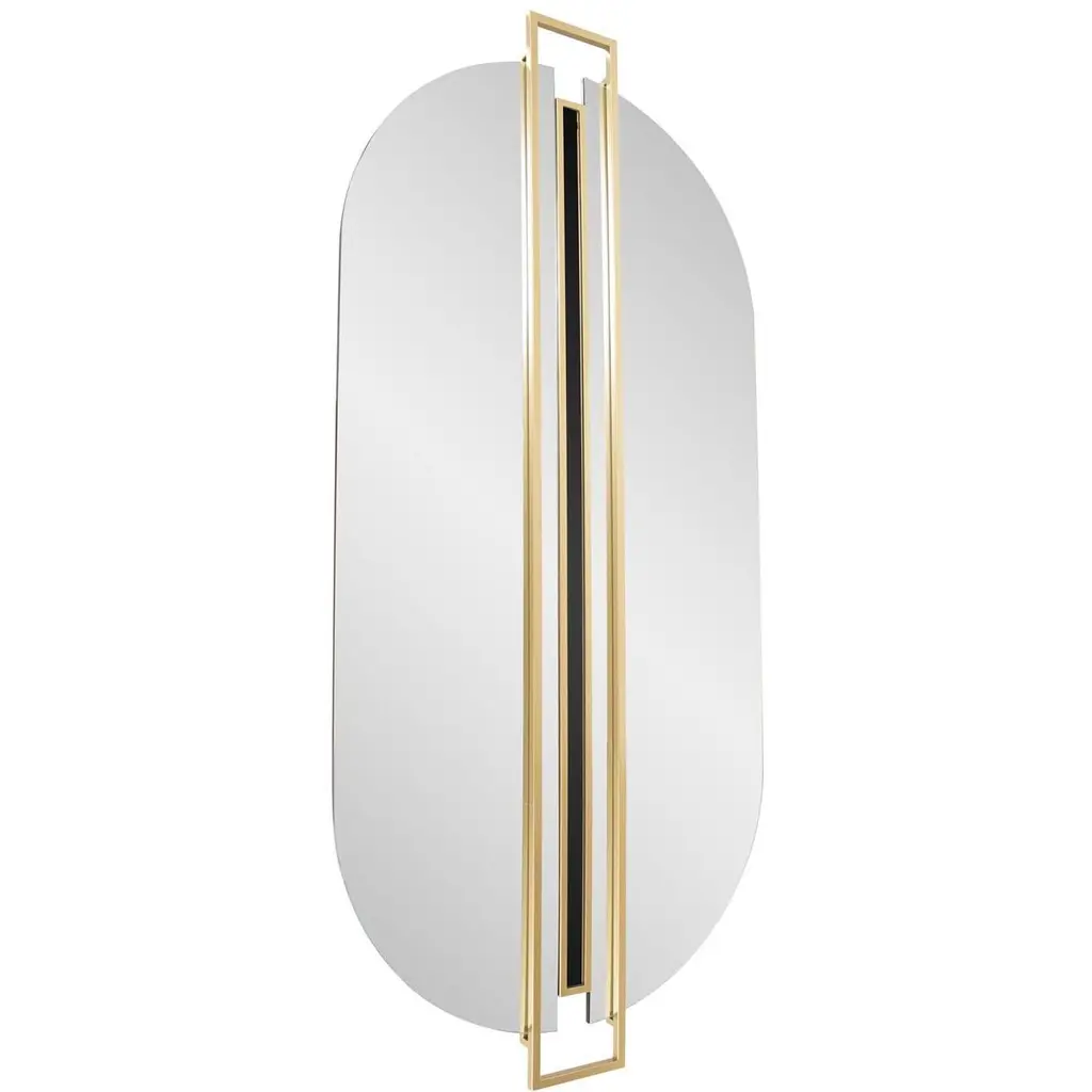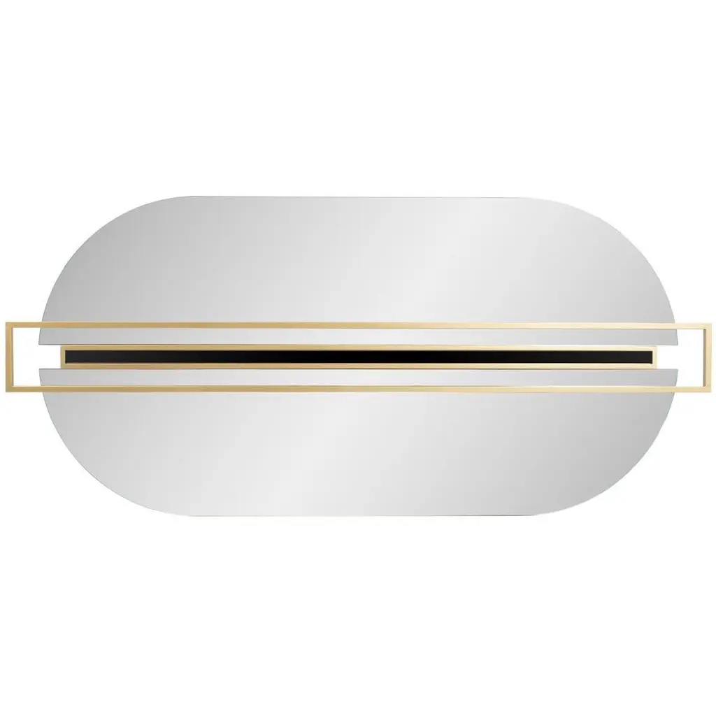 A truly unique statement piece that defies conventional design. With its frameless design and versatile hanging options in both vertical and horizontal orientations, this mirror offers endless possibilities for styling. The oval shape is complemented by a rectangular brushed gold piece in the middle, creating the illusion of two half-oval pieces connected together. This distinctive feature gives the mirror a striking appearance, reminiscent of a cave between the two halves.