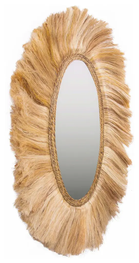 Handcrafted by skilled artisans, the Tribal Mirror is that femme-safari piece you absolutely need. With its palpable-cool style and luxurious texture, this mirror will make a beautiful statement in your home.Handmade by skilled furniture craftsmenMade using natural materials, color variations are to be expectedReady to hangProduct Materials : AbacaOverall Product Dimensions : 25.6"W x 1.6"D x 35.4"HProduct Weight : 4.4 LBs