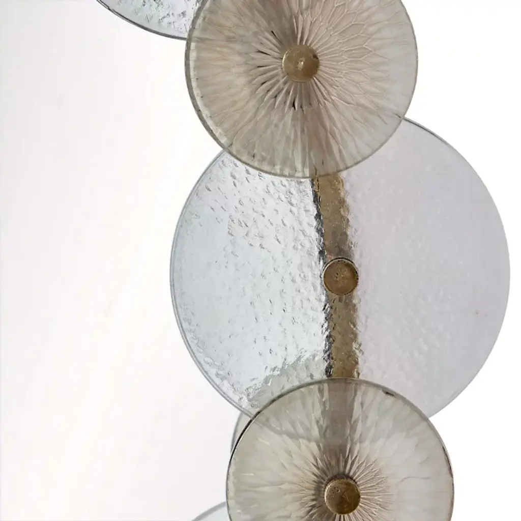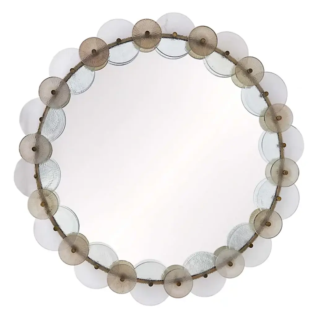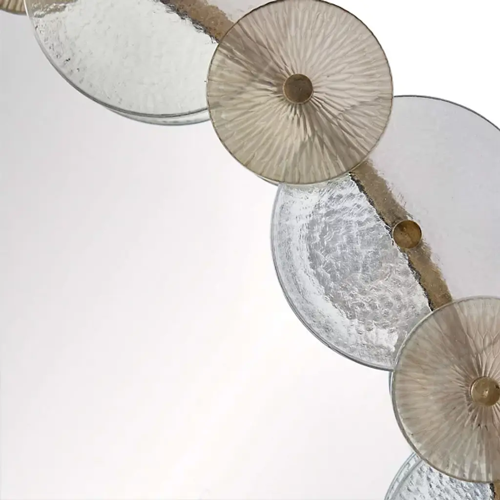 Arteriors presents the Trixie Mirror. This expertly crafted piece embodies the essence of Art Deco style, featuring a captivating design with circular iron framing and a layered collage of hammered clear and smoke-etched glass discs, creating a mesmerizing play of light and reflections. For your convenience, the mirror comes fitted with a cleat for easy hanging.