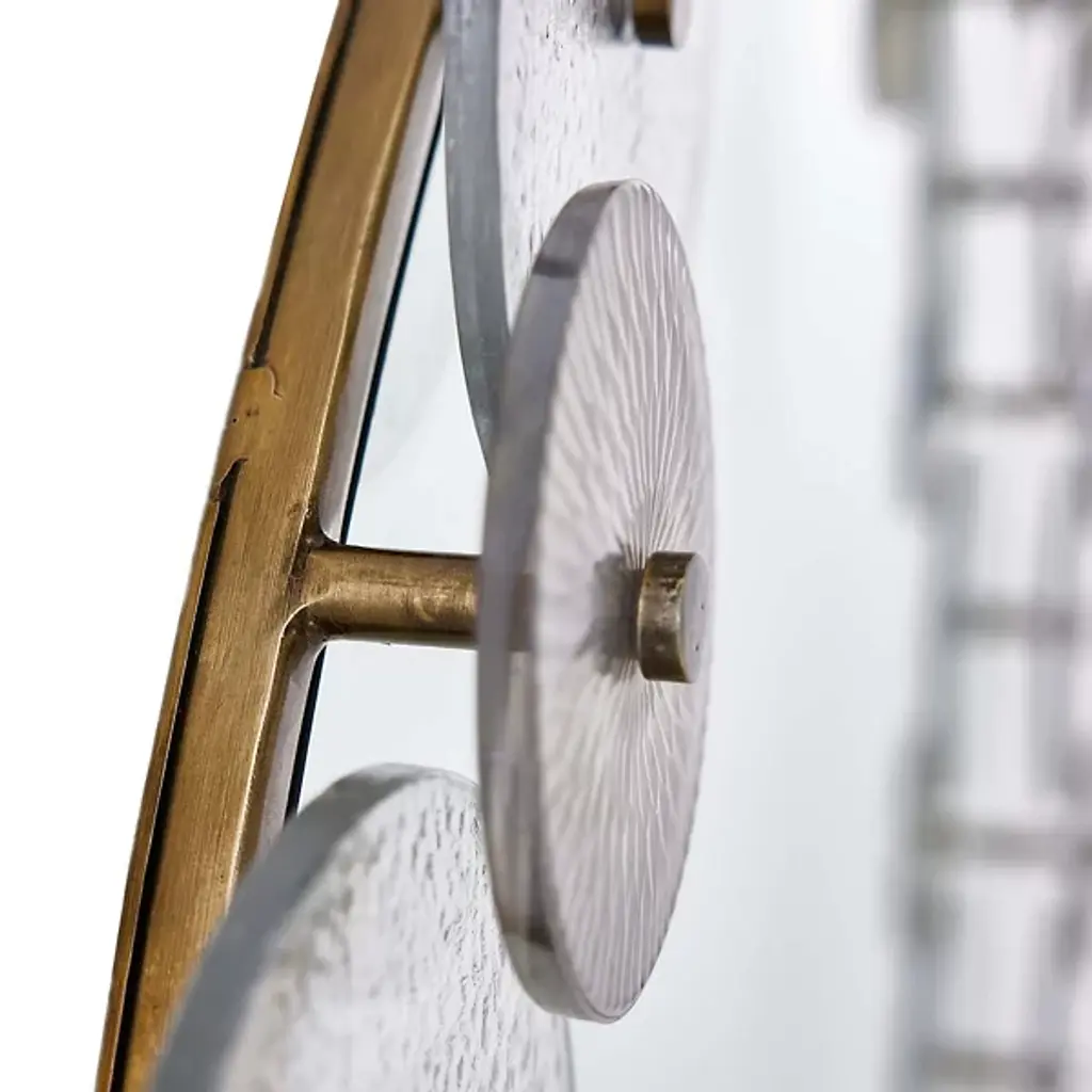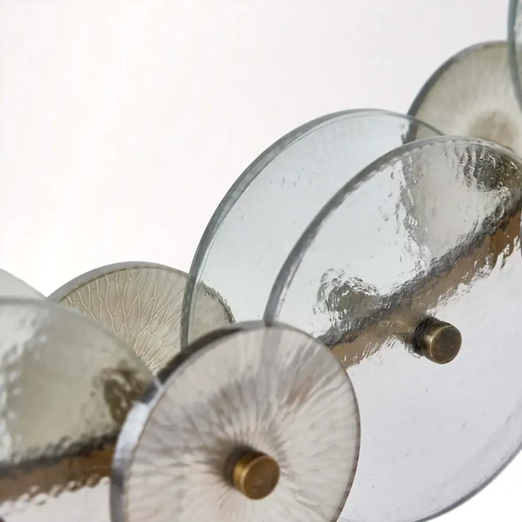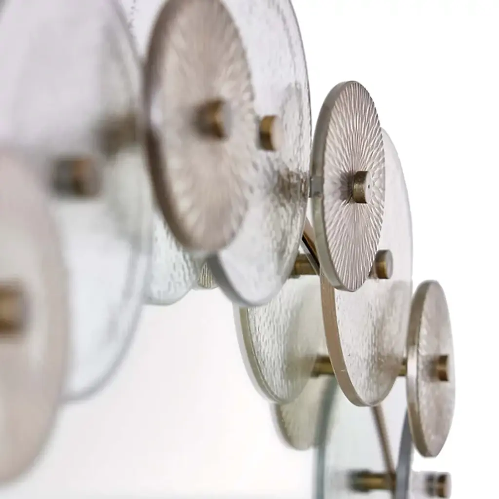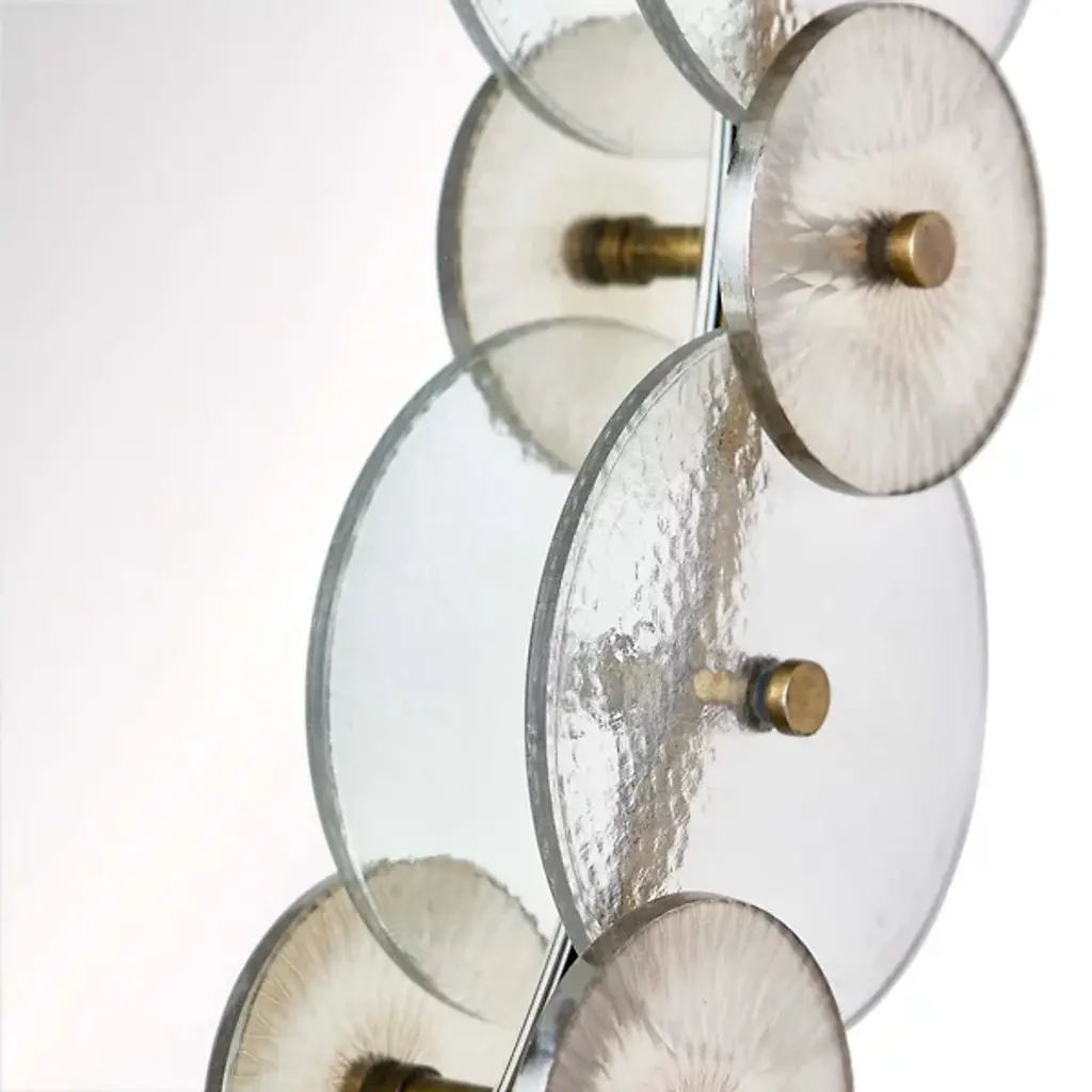 Arteriors presents the Trixie Mirror. This expertly crafted piece embodies the essence of Art Deco style, featuring a captivating design with circular iron framing and a layered collage of hammered clear and smoke-etched glass discs, creating a mesmerizing play of light and reflections. For your convenience, the mirror comes fitted with a cleat for easy hanging.