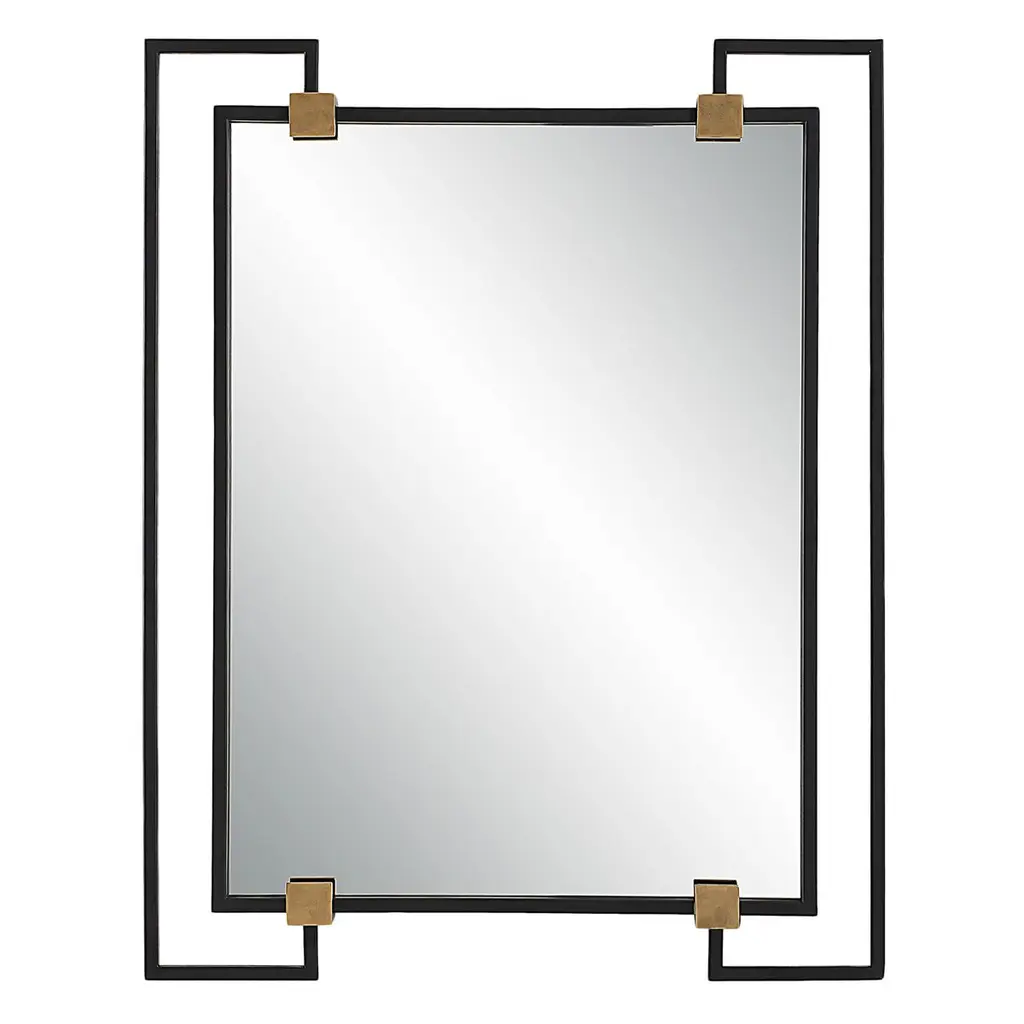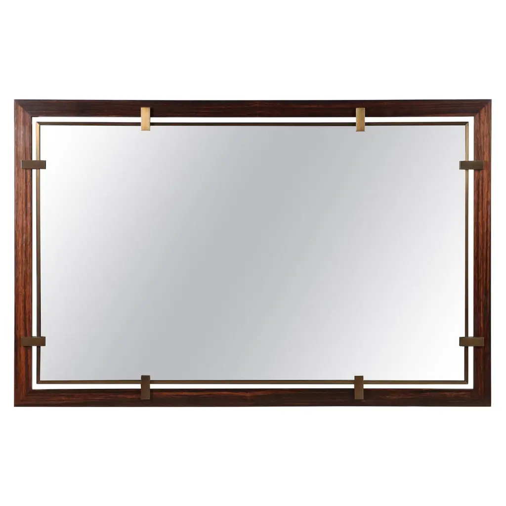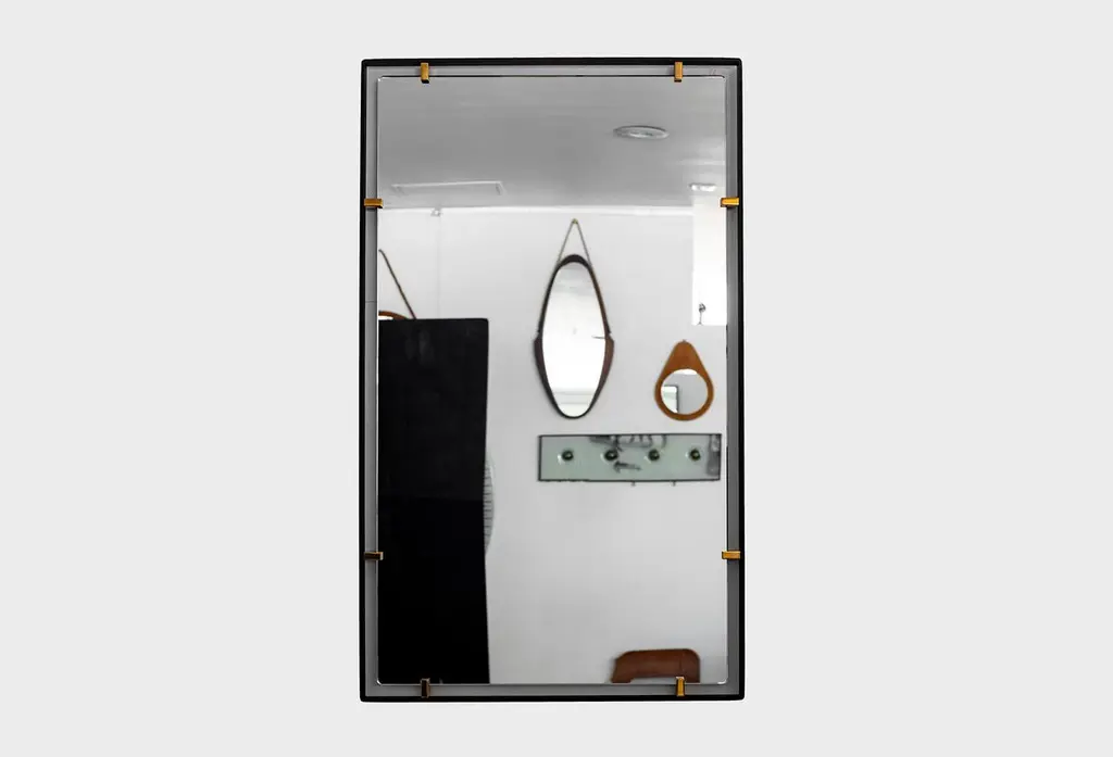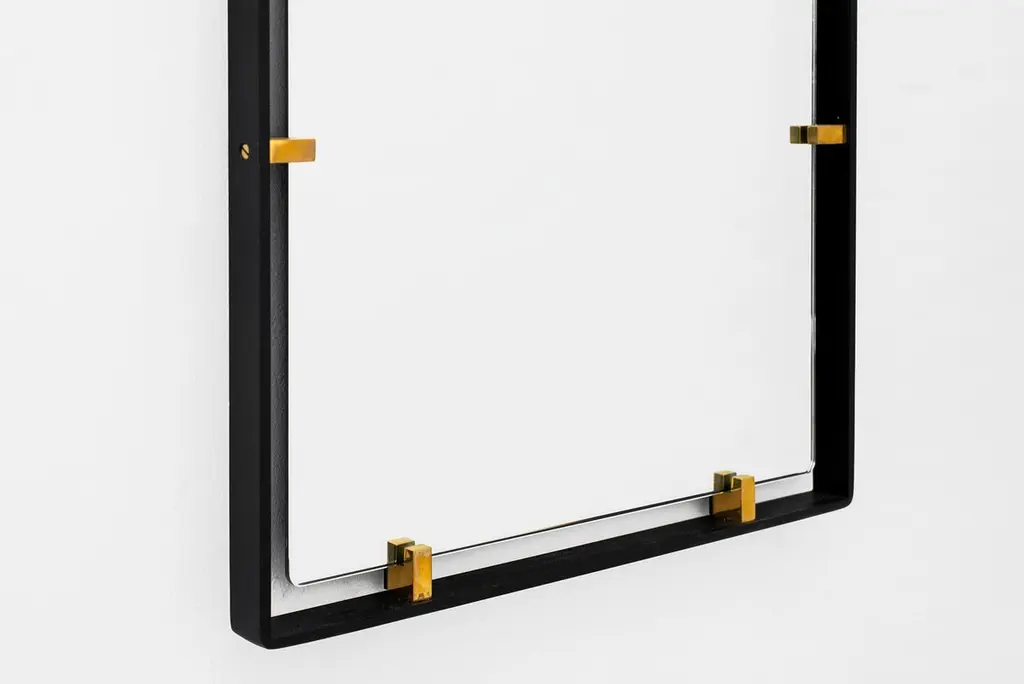 Iron frame and polished brass clasps support a floating rectangular mirror. Modeled after a vintage Italian design, newly produced at orange. Customizable sizes and finishes available.