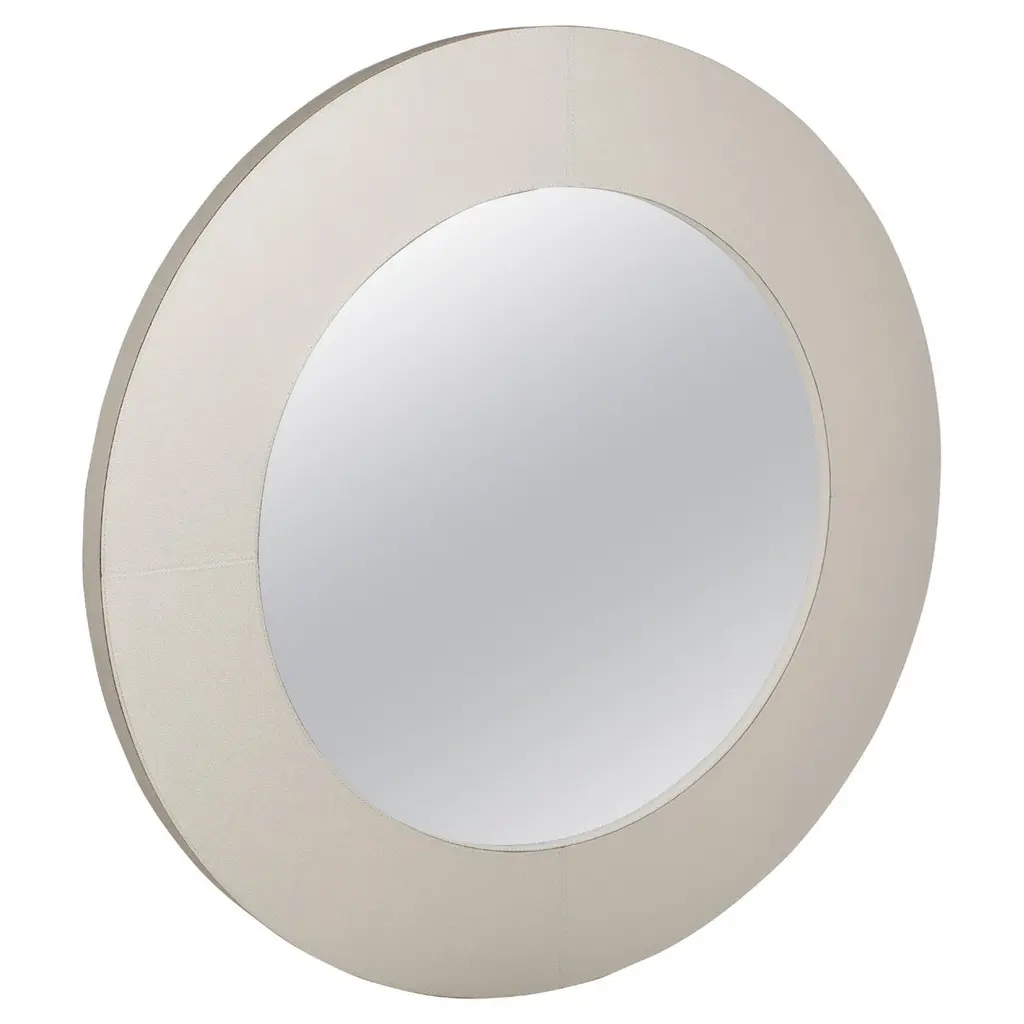 The Tufted Mirror is a sleek, contemporary piece that imbues a space with stylish curves and dimensional depth. Upholstered in gray leather, the frame showcases a stunning tufted look. This mirror is installed using French cleats and hangs in a vertical orientation.
